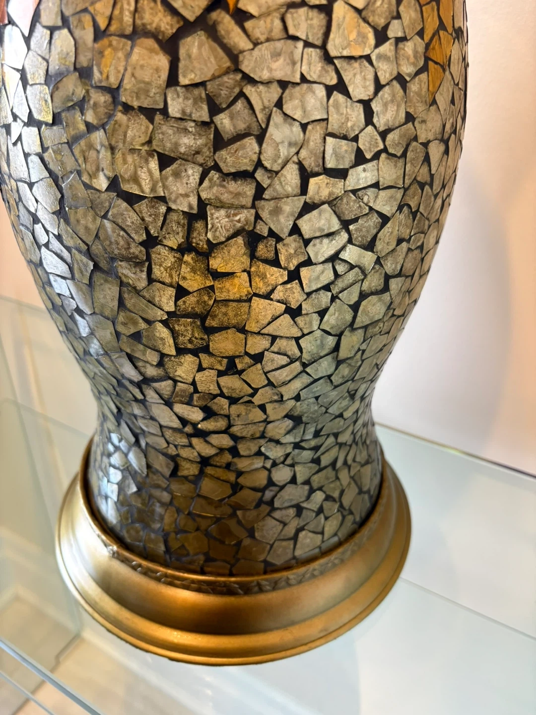 Beautiful mosaic glass candle holder with a unique design! The vase features a stunning mosaic pattern in shades of gold, silver, and black. It would make a lovely addition to any room in your home