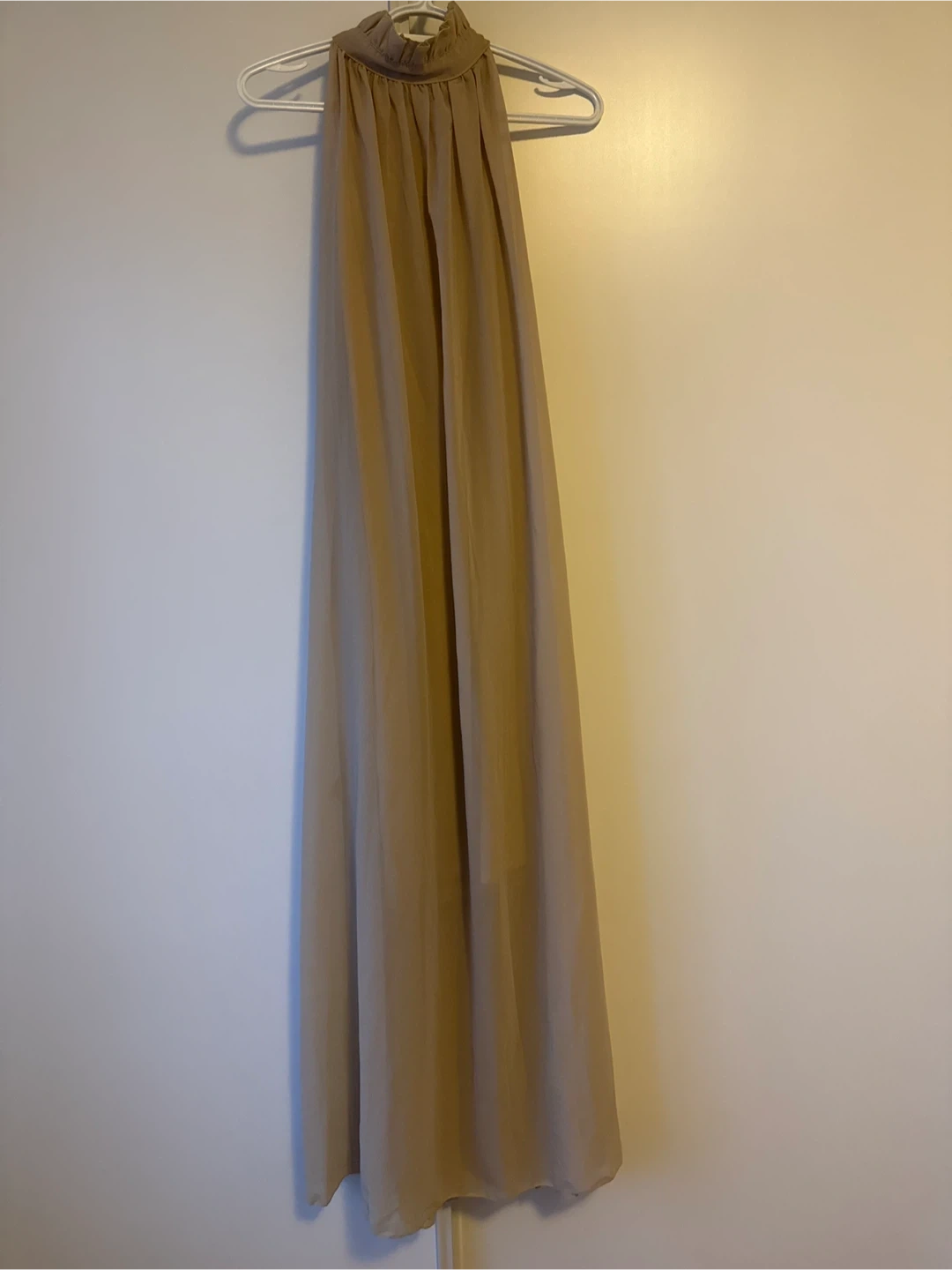 Selling a beautiful beige maxi dress. It's in great condition and perfect for a special occasion or a night out. The dress features a halter neckline and a flowing skirt. It's a stylish and comfortable piece that would look great on anyone!