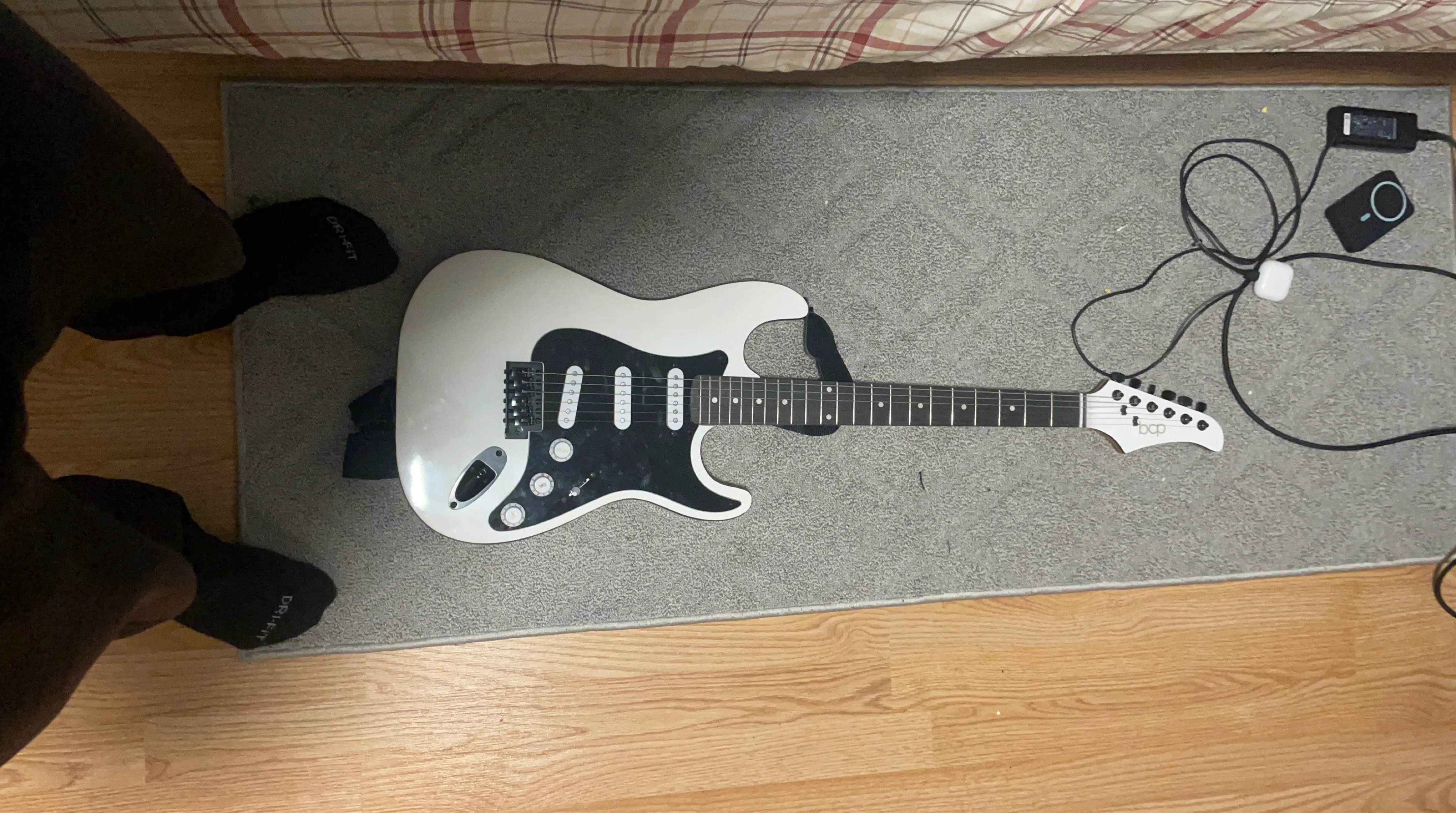 White electric guitar with a black pickguard. It has a standard bridge and tuning pegs. Includes a strap and some cables. Great for beginners!