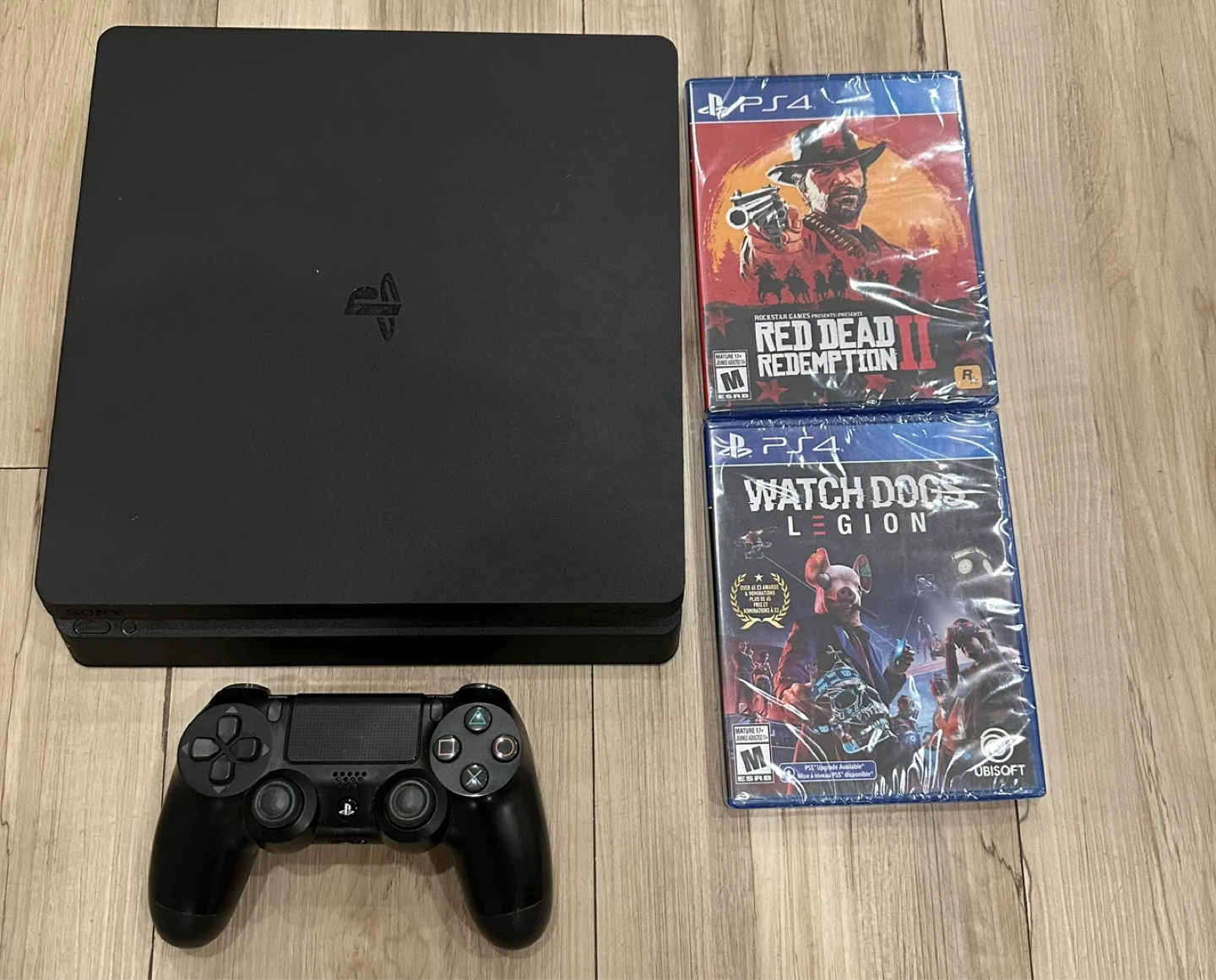 PS4 Slim 1TB with 2 brand new sealed games: Red Dead Redemption 2 and Watchdogs Legion.