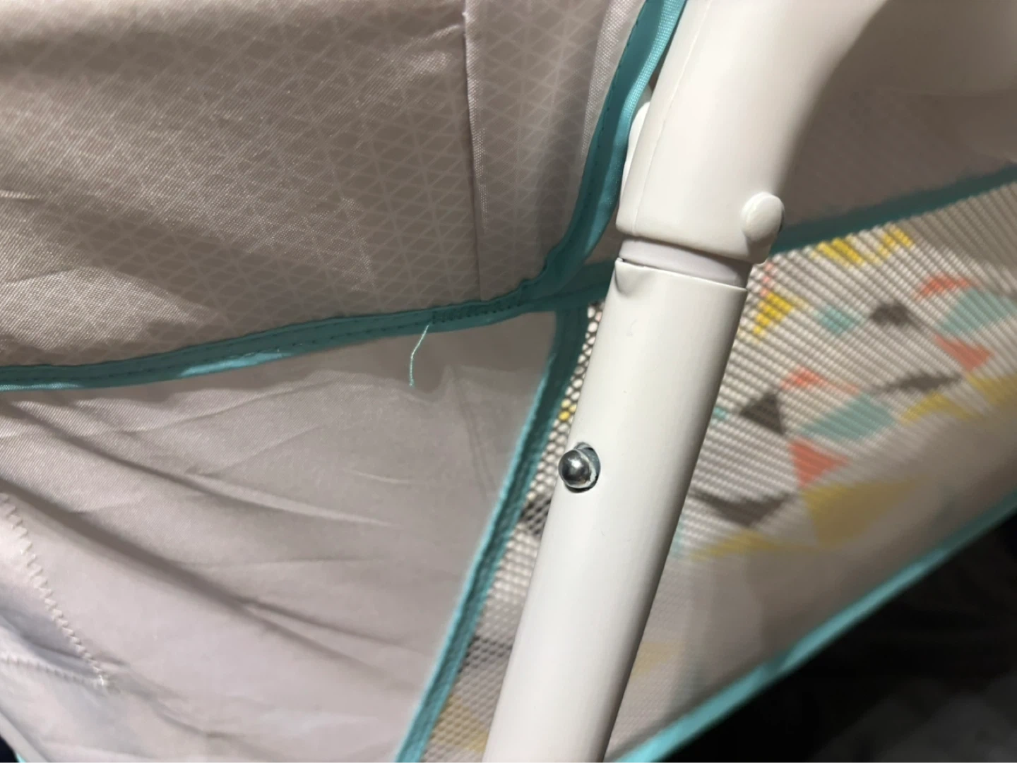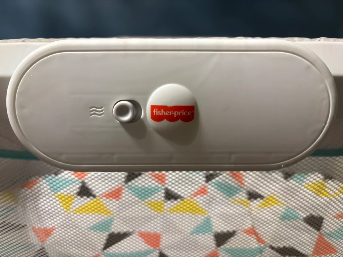This Fisher-Price bassinet has a grey patterned fabric with teal trim. It features mesh sides for airflow and a colourful geometric-patterned mattress. Perfect for keeping your little one close by!