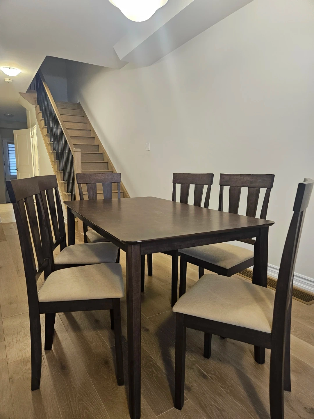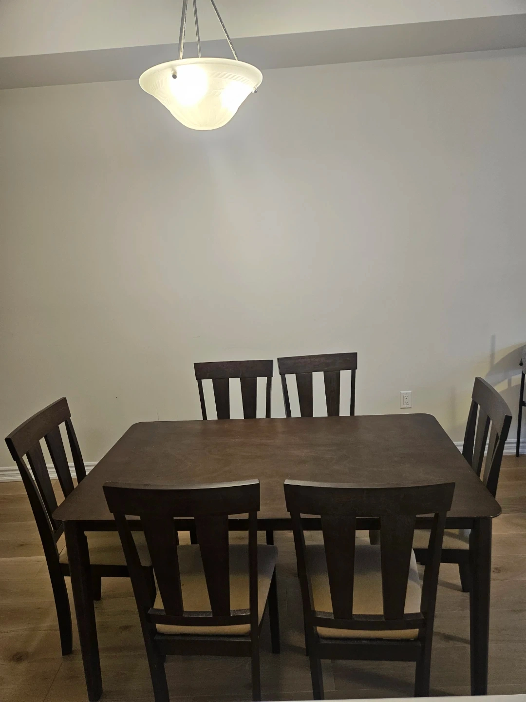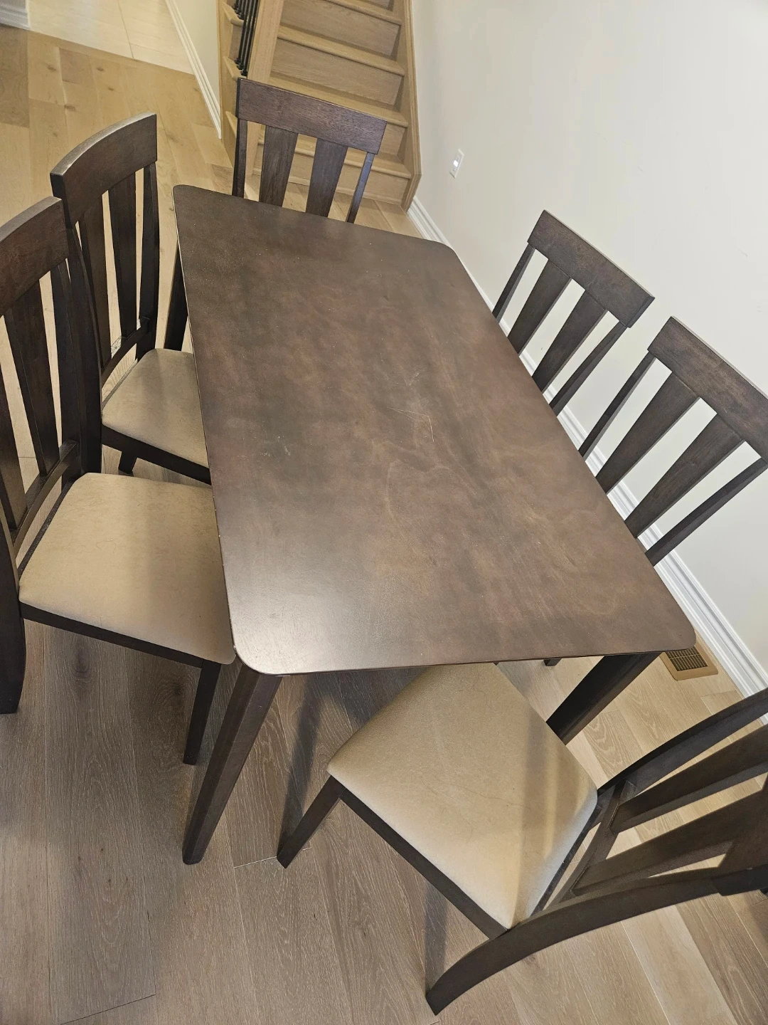 Beautiful solid wood dining table with 6 matching chairs available!