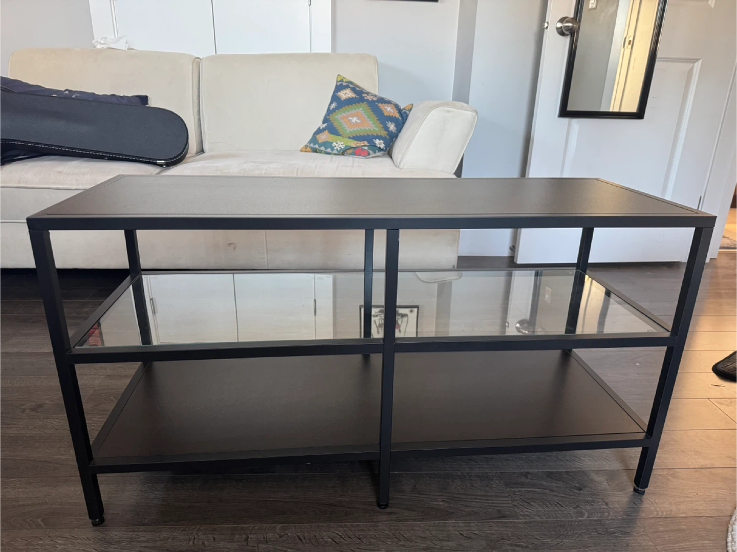 Stylish and sturdy TV bench/shelf / storage unit, with a sleek mixed-material design. The top and bottom shelves is wood, paired with a glass middle shelf and a durable metal frame.