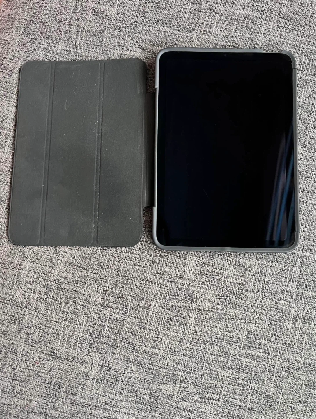 This is an Apple iPad Mini, charcoal grey colour, and it comes with a black case. It's in good working condition. Perfect for browsing, emails, and apps!
