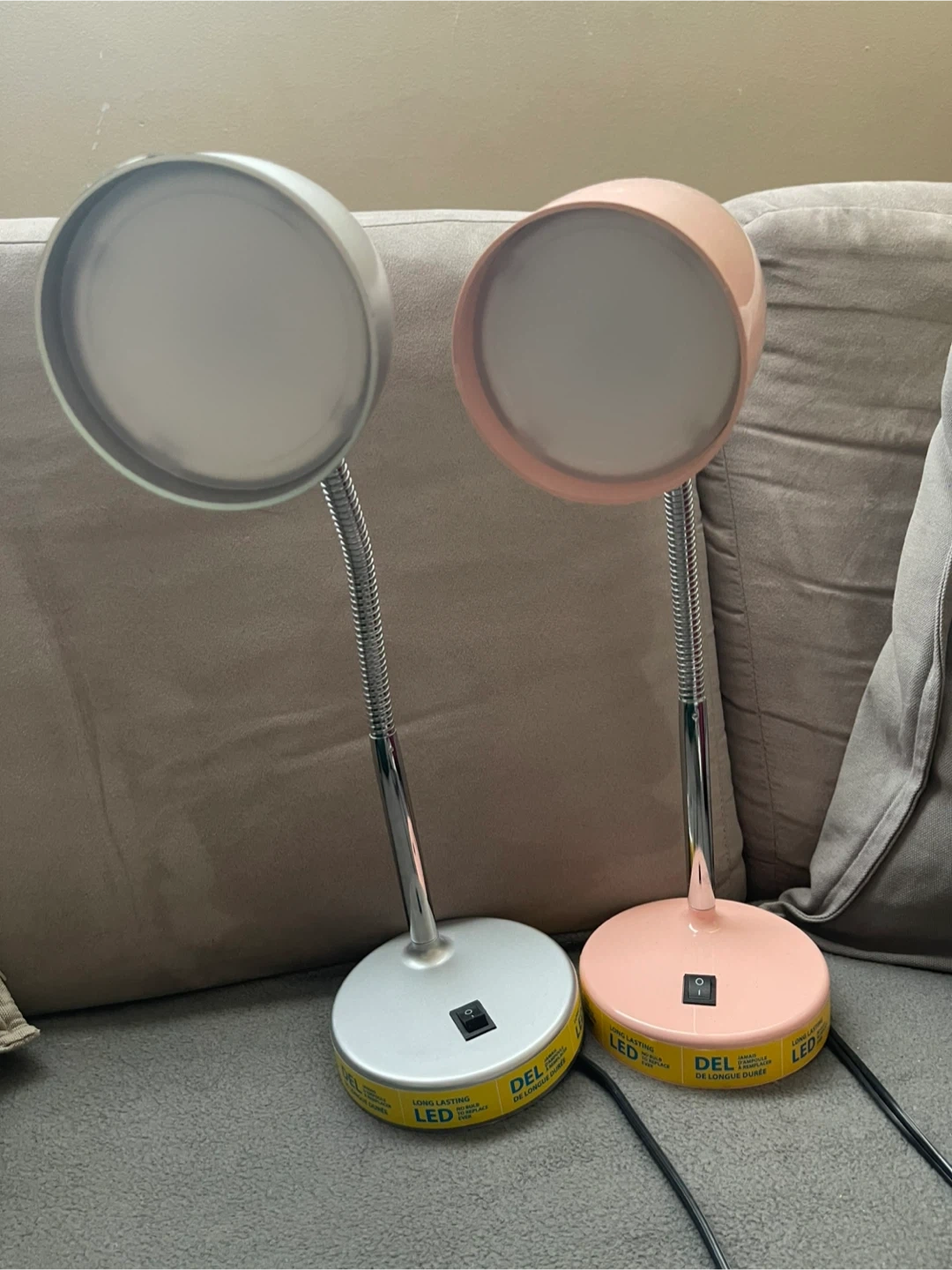 Two DEL LED desk lamps included, one in pink and one in silver. They're adjustable with flexible goosenecks. These lamps are energy-efficient with long-lasting LED lights.