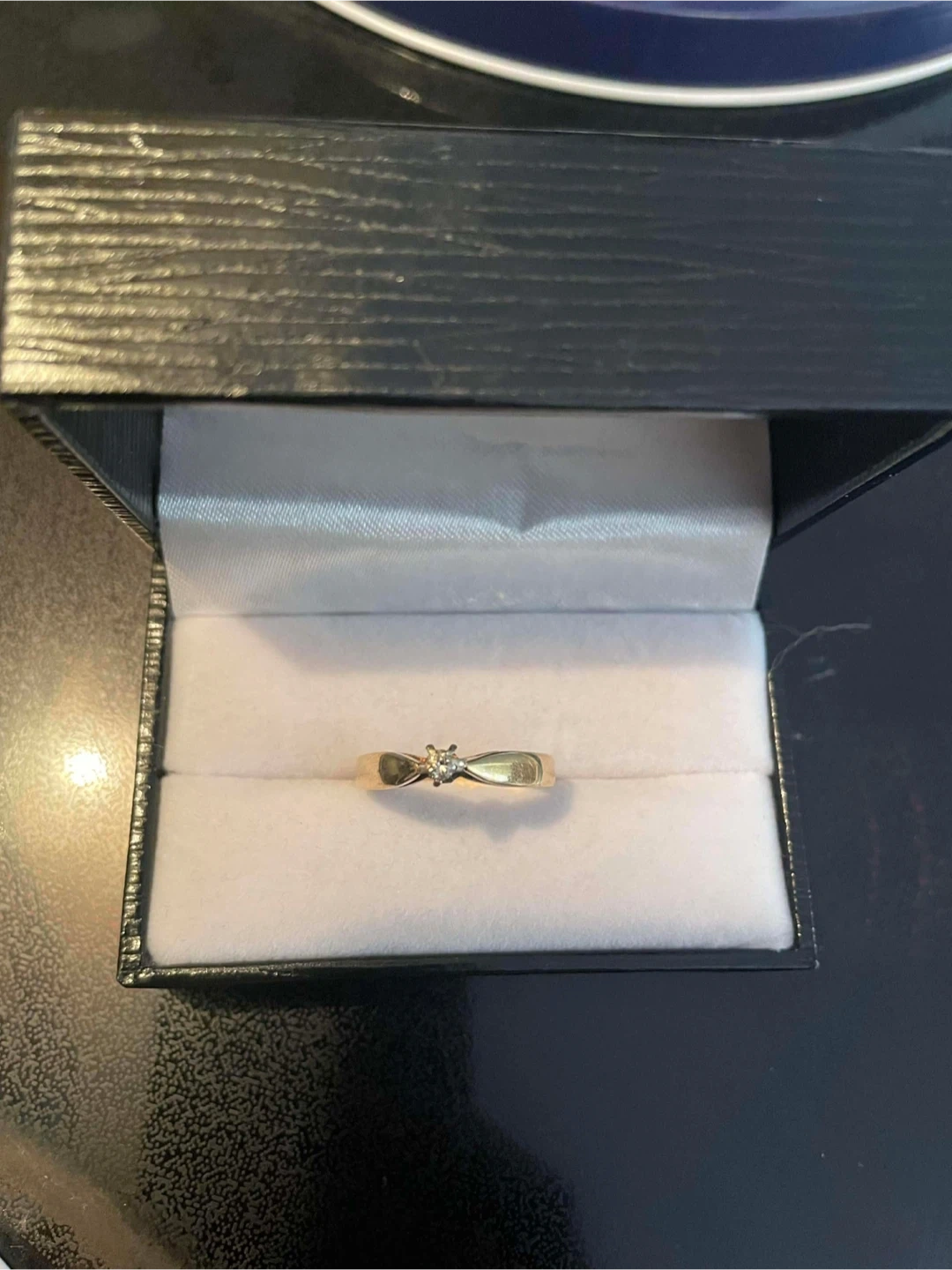 A classic gold ring set with a single diamond. It comes in a black textured presentation box with a white satin lining. This ring would make a thoughtful gift for a special occasion.