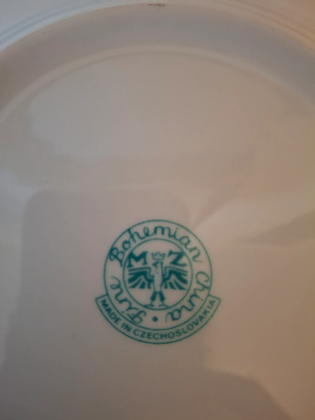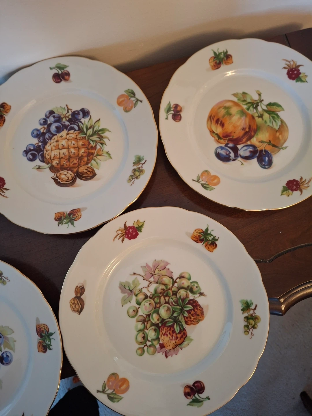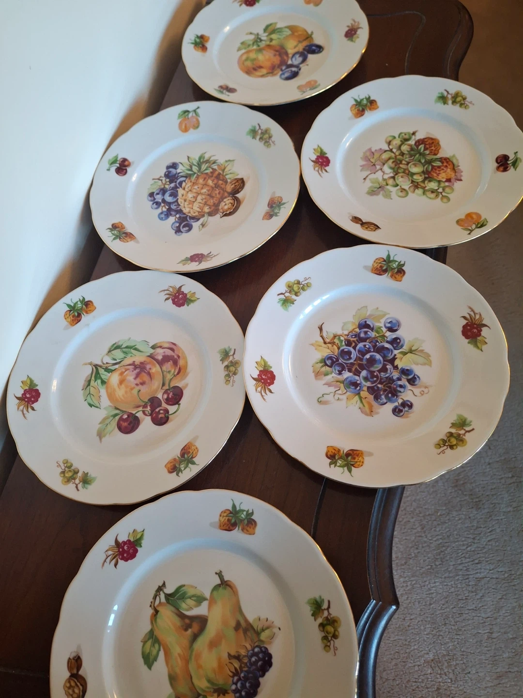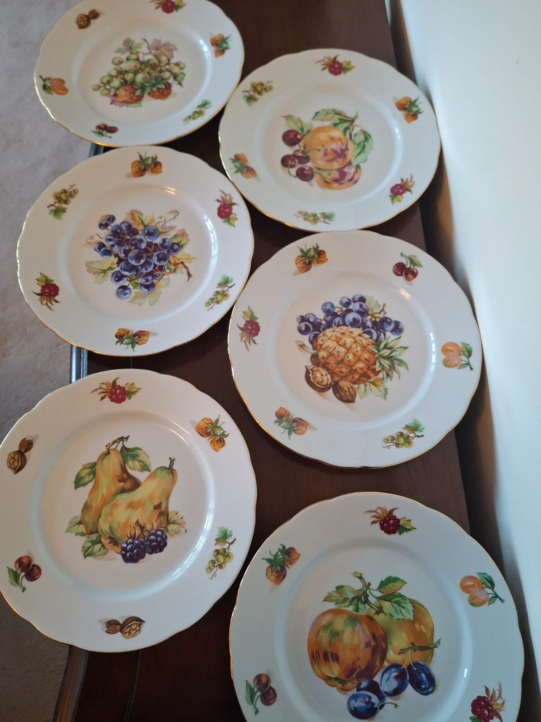 6 small salad/dessert plates, vintage Bohemian fine china (made in former Czechoslovakia). Features unique fruit designs on each plate (each one is different). Fluted gold rim.