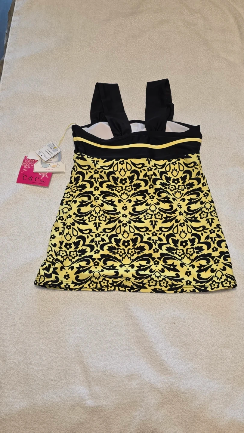 swim top features a yellow and black damask pattern. It offers UV protection for sunny days. Built-in bra with adjustable straps.
