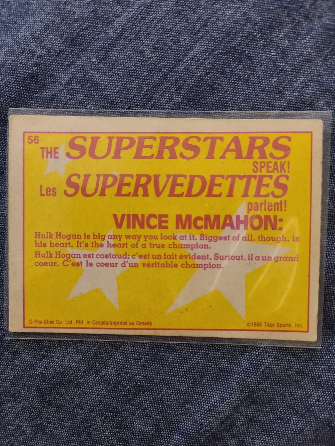 This is a 1985 O-Pee-Chee The Superstars Speak! trading card featuring Vince McMahon. The card includes quotes from Vince McMahon about Hulk Hogan. Manufactured by Titan Sports, Inc.