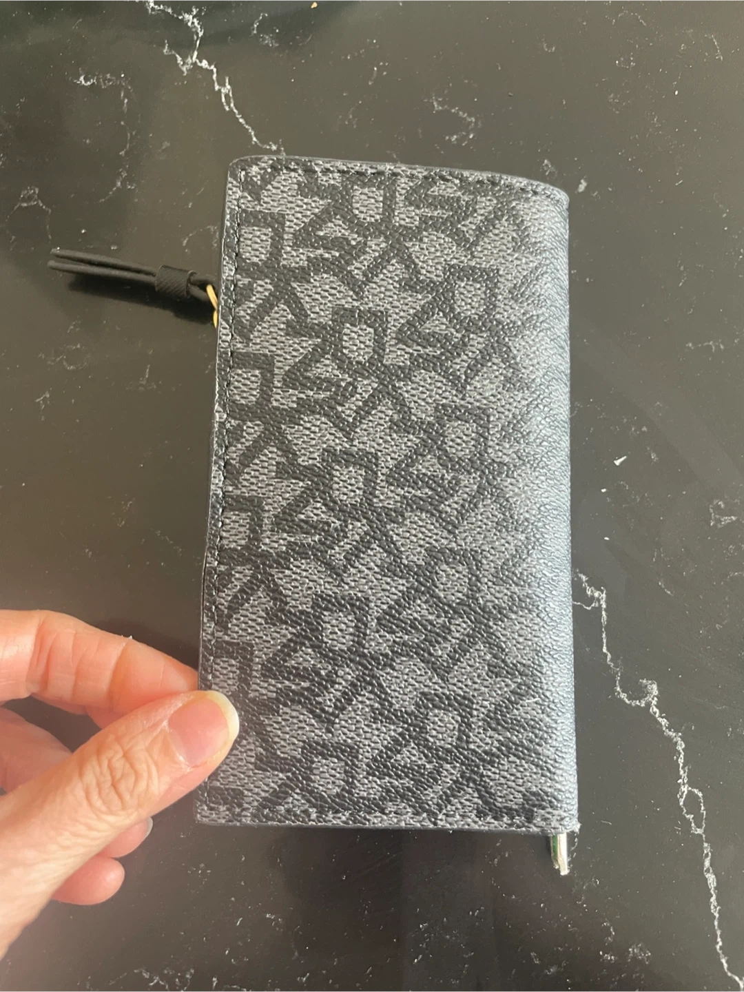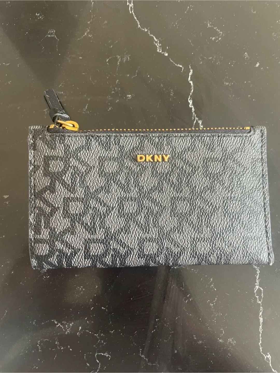 This is a DKNY card holder wallet with a black all-over logo print. It's got a zipper closure and a gold-tone DKNY emblem on the front. Plenty of room for cards!