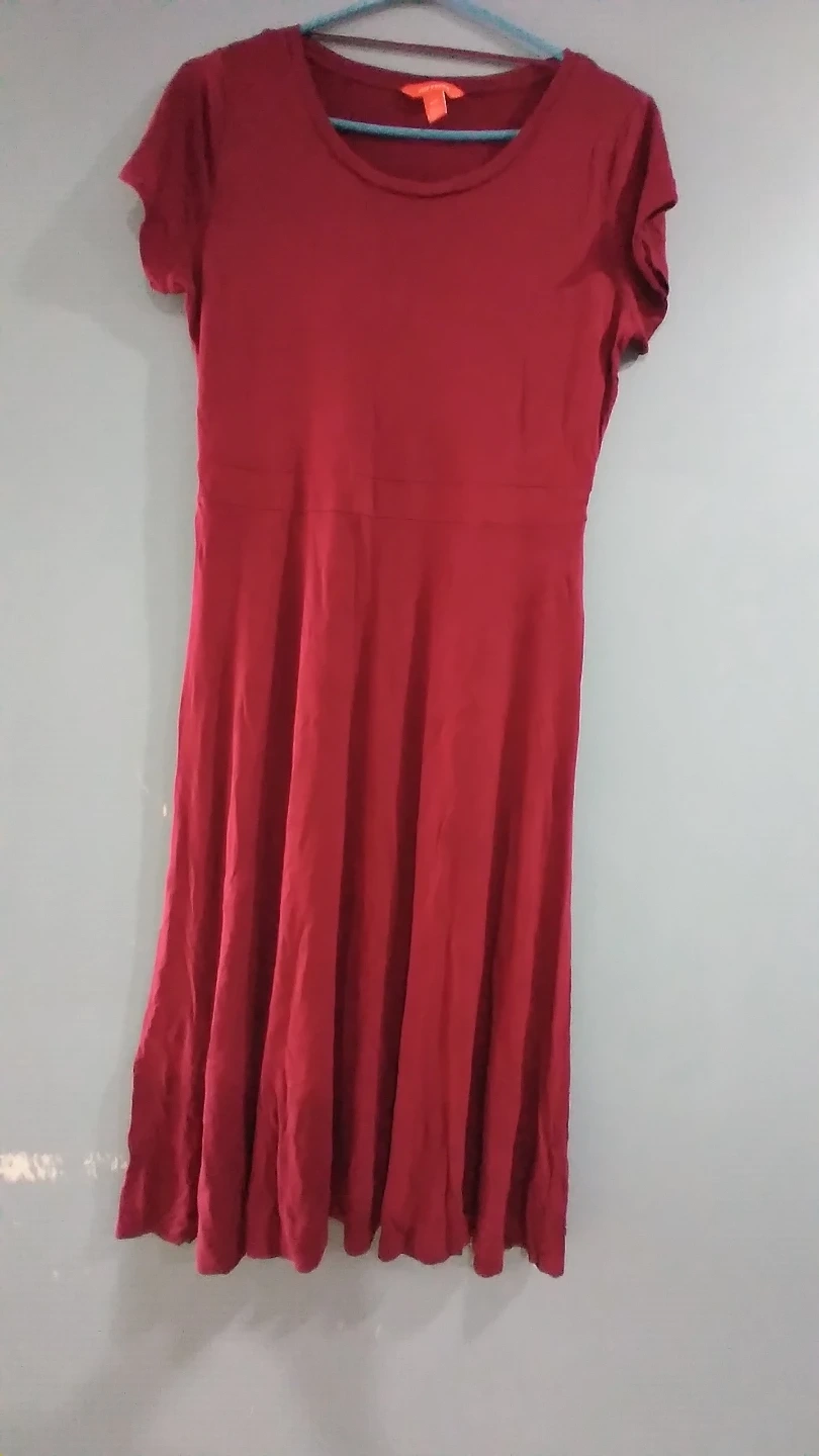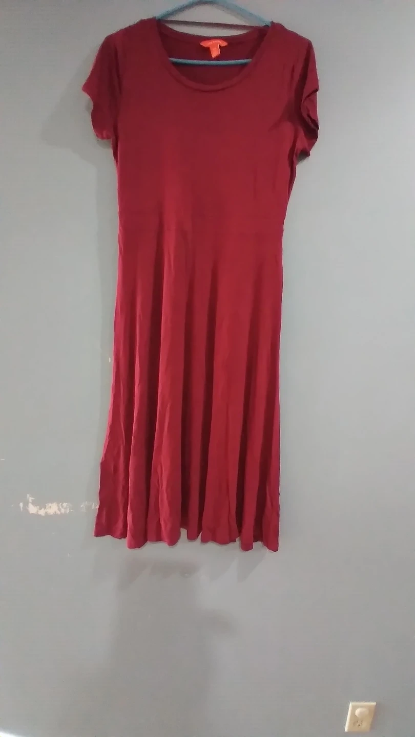 A simple red midi dress with short sleeves and a flattering A-line skirt. It's made from a comfortable, stretchy fabric. This dress is perfect for casual outings or can be dressed up for a more formal occasion.