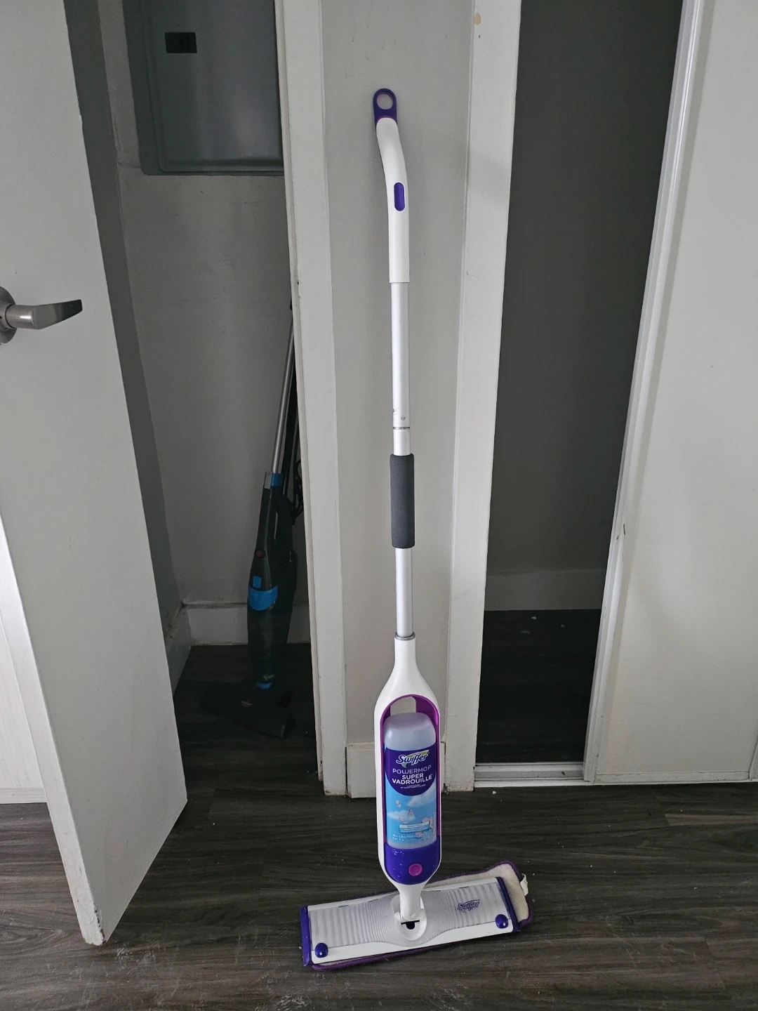 This is a Swiffer PowerMop. It's white and purple and comes with a cleaning solution bottle. The mop head is detachable. It's great for quick floor cleanups!