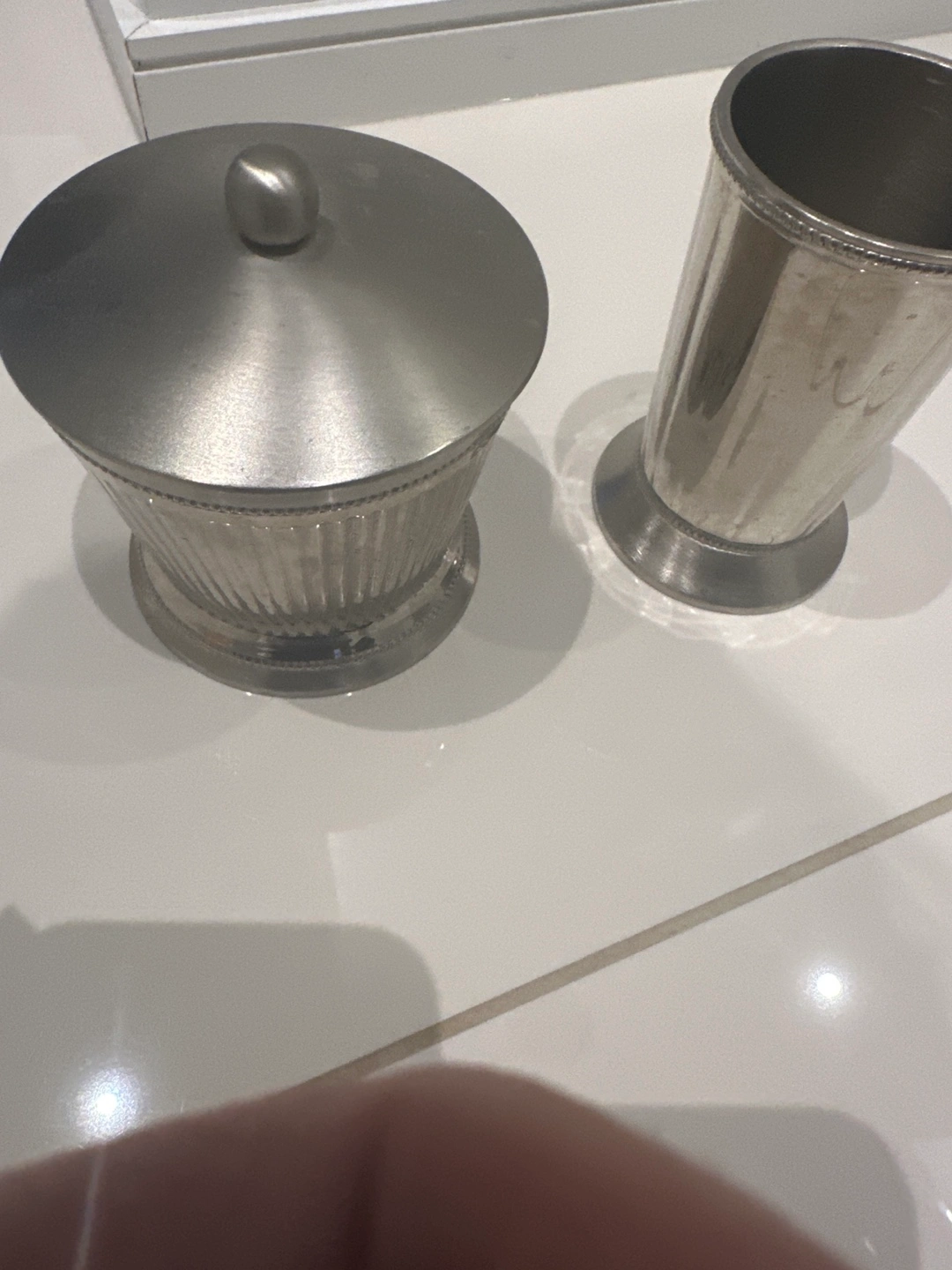Elegant silver bathroom set. Includes cotton ball holder with lid, tumbler, and soap dispenser. Matching design. Great for a modern bathroom.