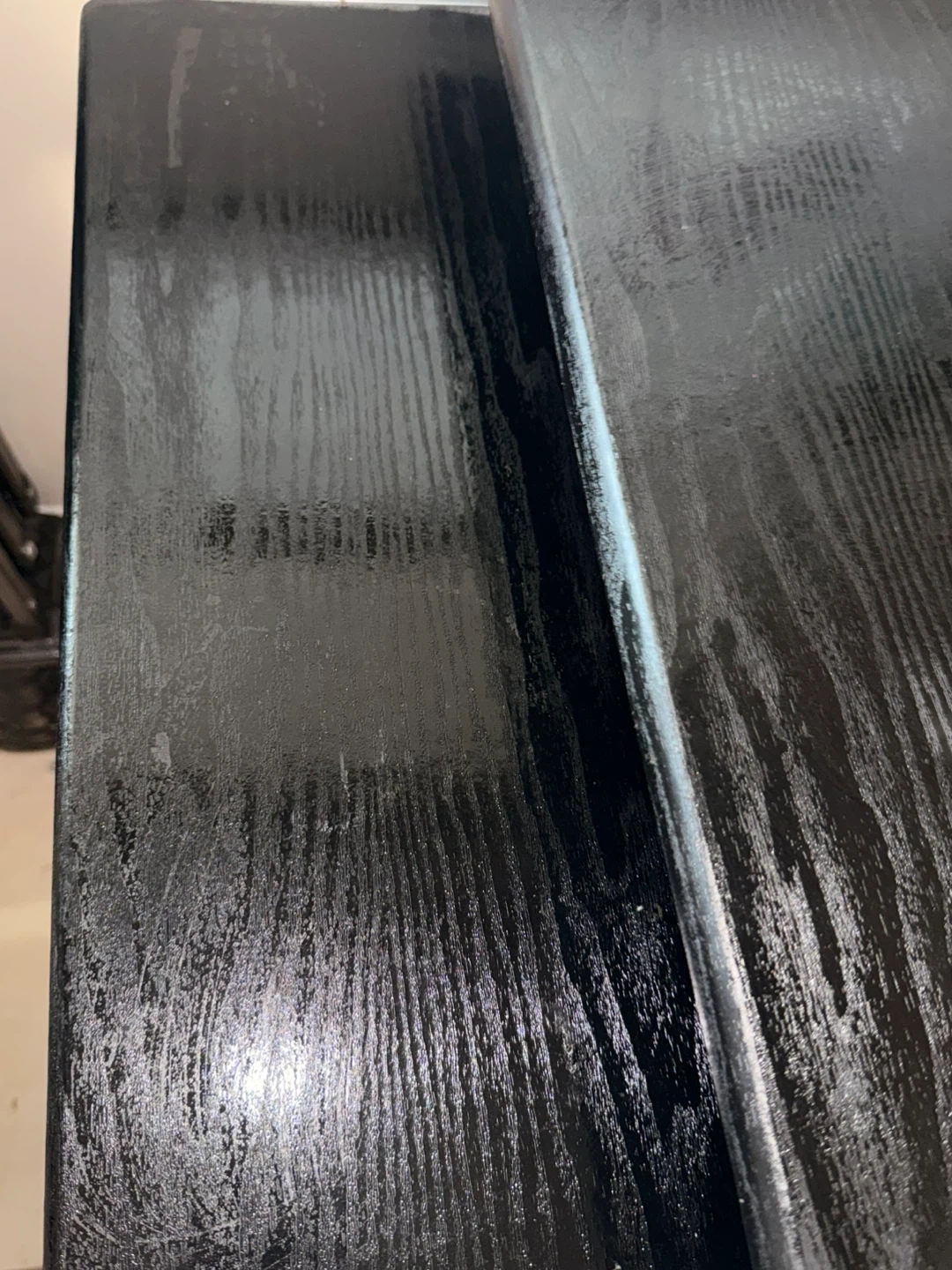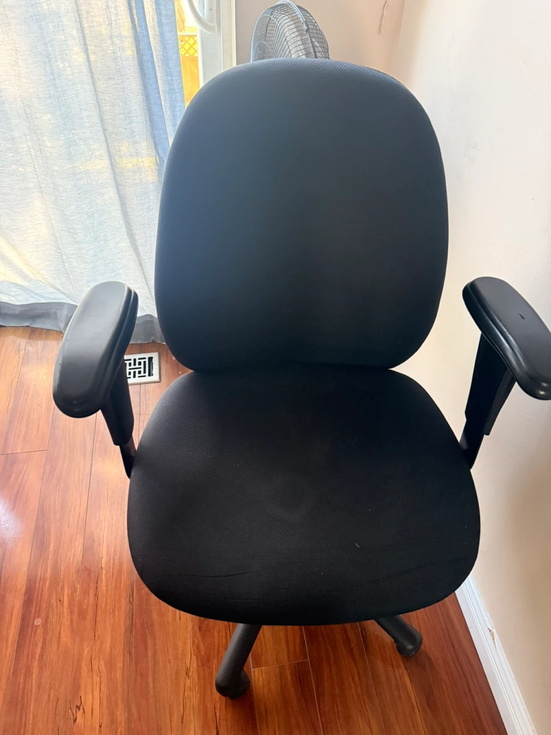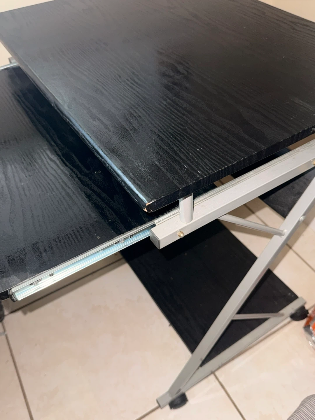 Compact black 2-tier work desk. Has a cool sliding top shelf, great for keyboard or just extra space. Metal frame is sturdy. Rolling chair to go with the desk. Good for a small spot or home office setup.