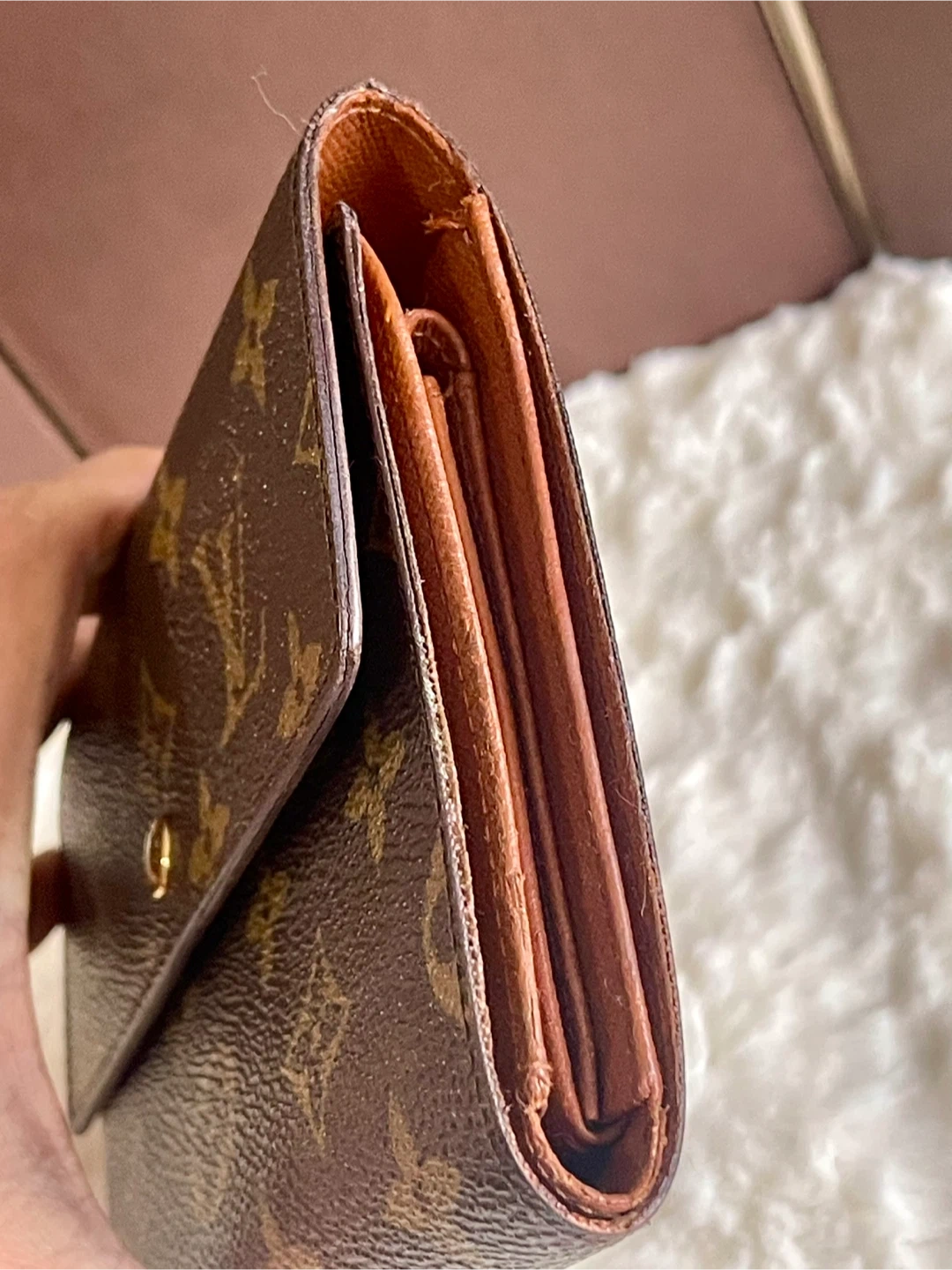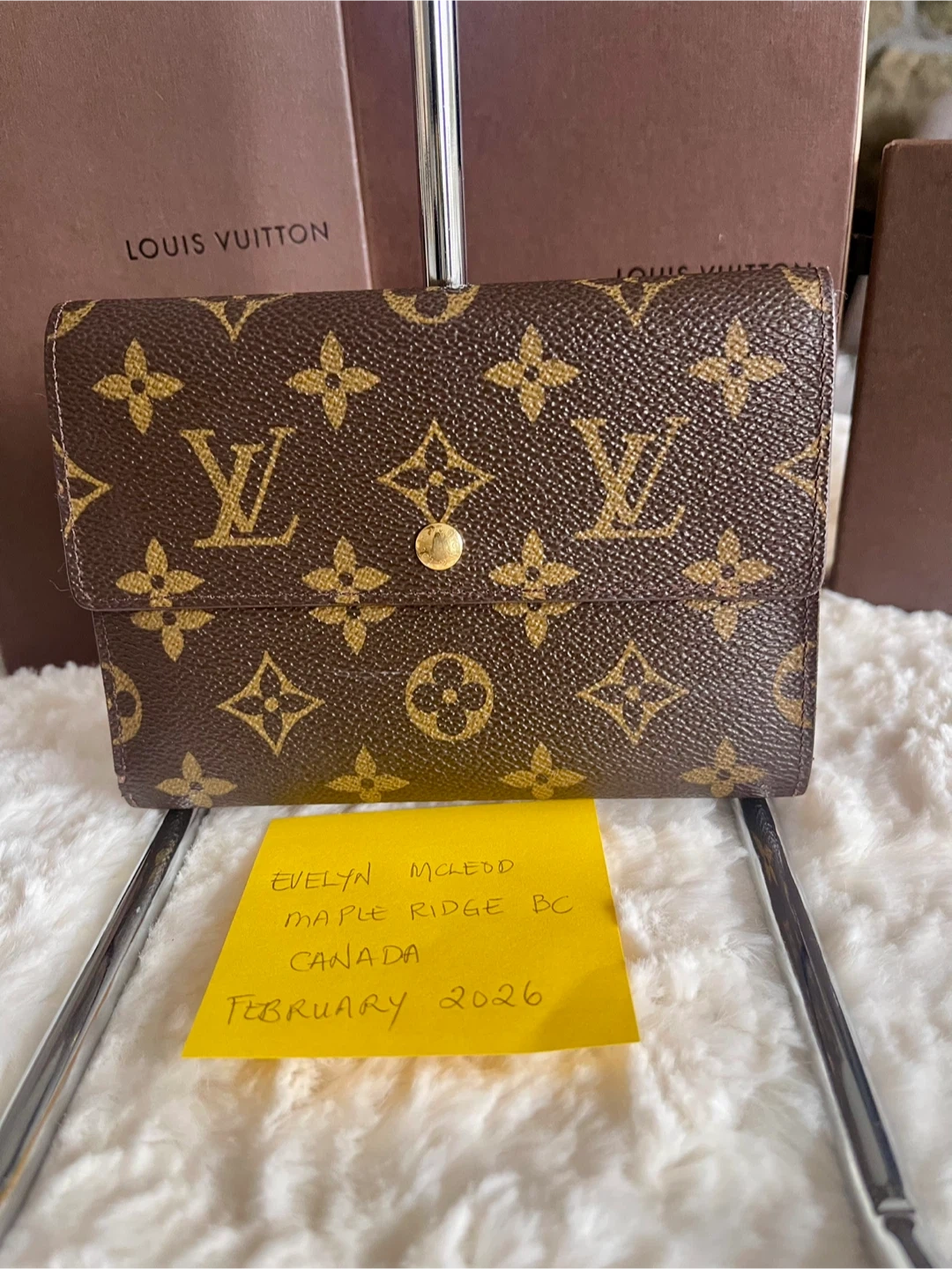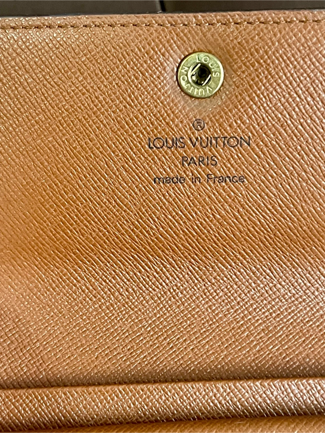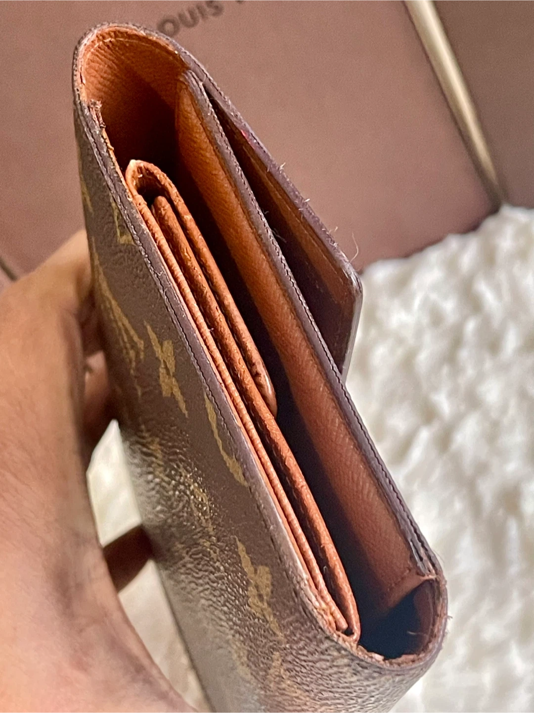 Louis Vuitton bifold wallet in classic monogram canvas. Interior features multiple card slots and compartments. Made in France.