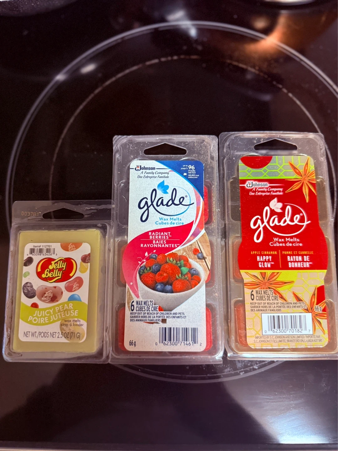 This pack includes Glade Radiant Berries and Apple Cinnamon Happy Glow wax melts, plus a Jelly Belly Juicy Pear wax melt. Each Glade pack contains 6 cubes and provides up to 96 hours of fragrance. The Jelly Belly pack contains 2.5 oz of wax.