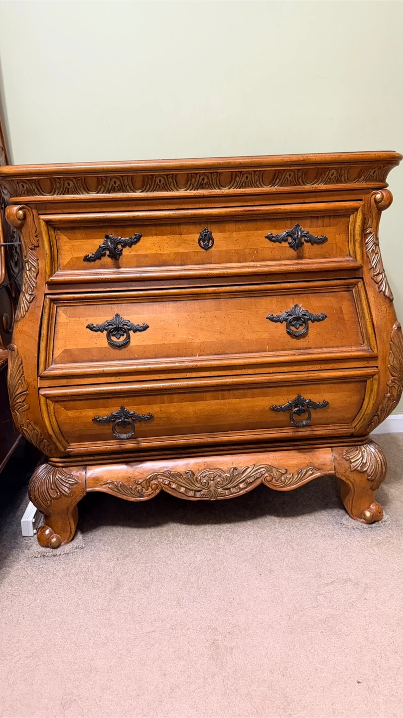 Selling a beautiful, ornate wooden dresser with three drawers. It has a classic design with decorative carvings and metal hardware. It's in good condition and ready to add a touch of elegance to your home!