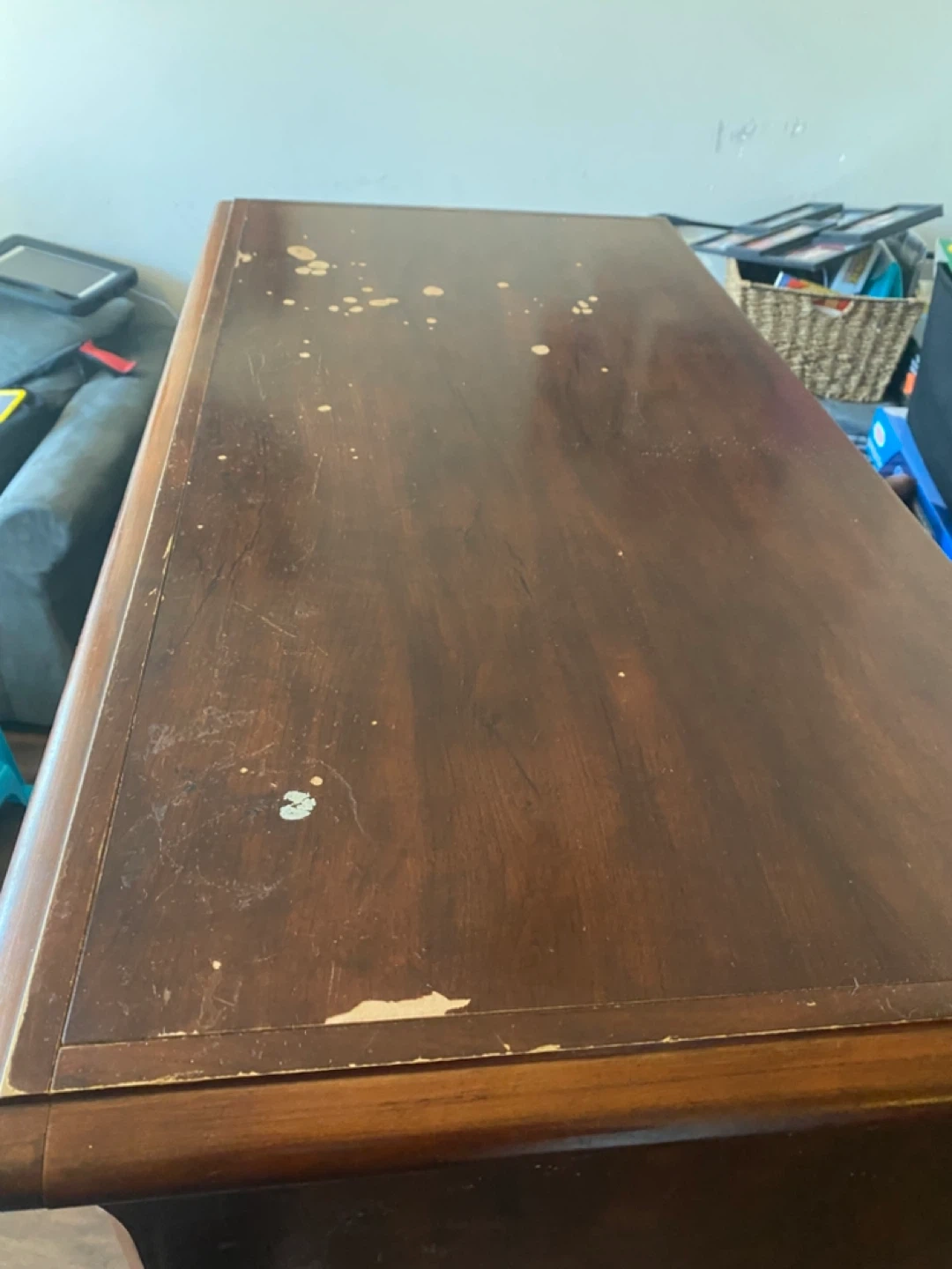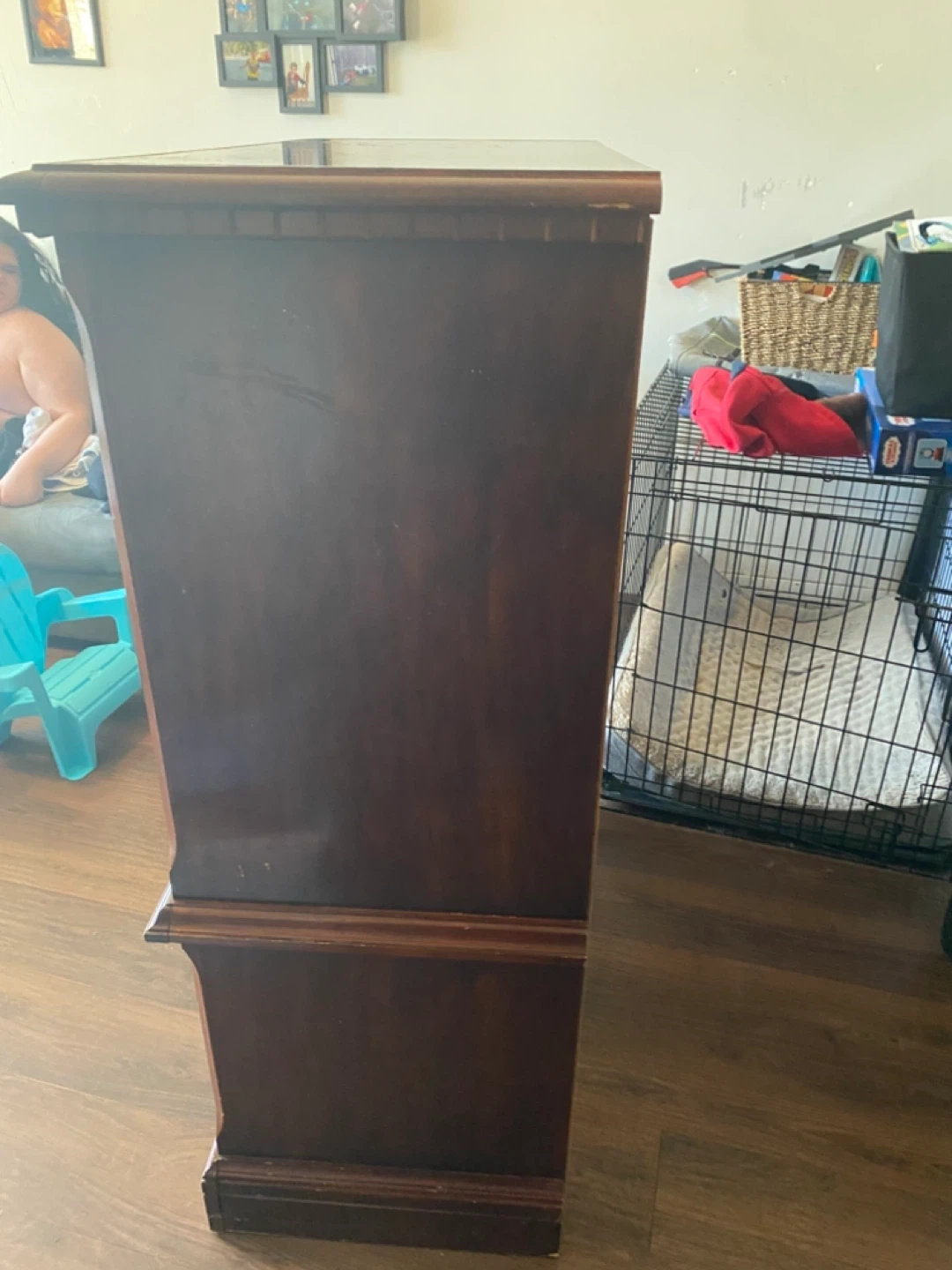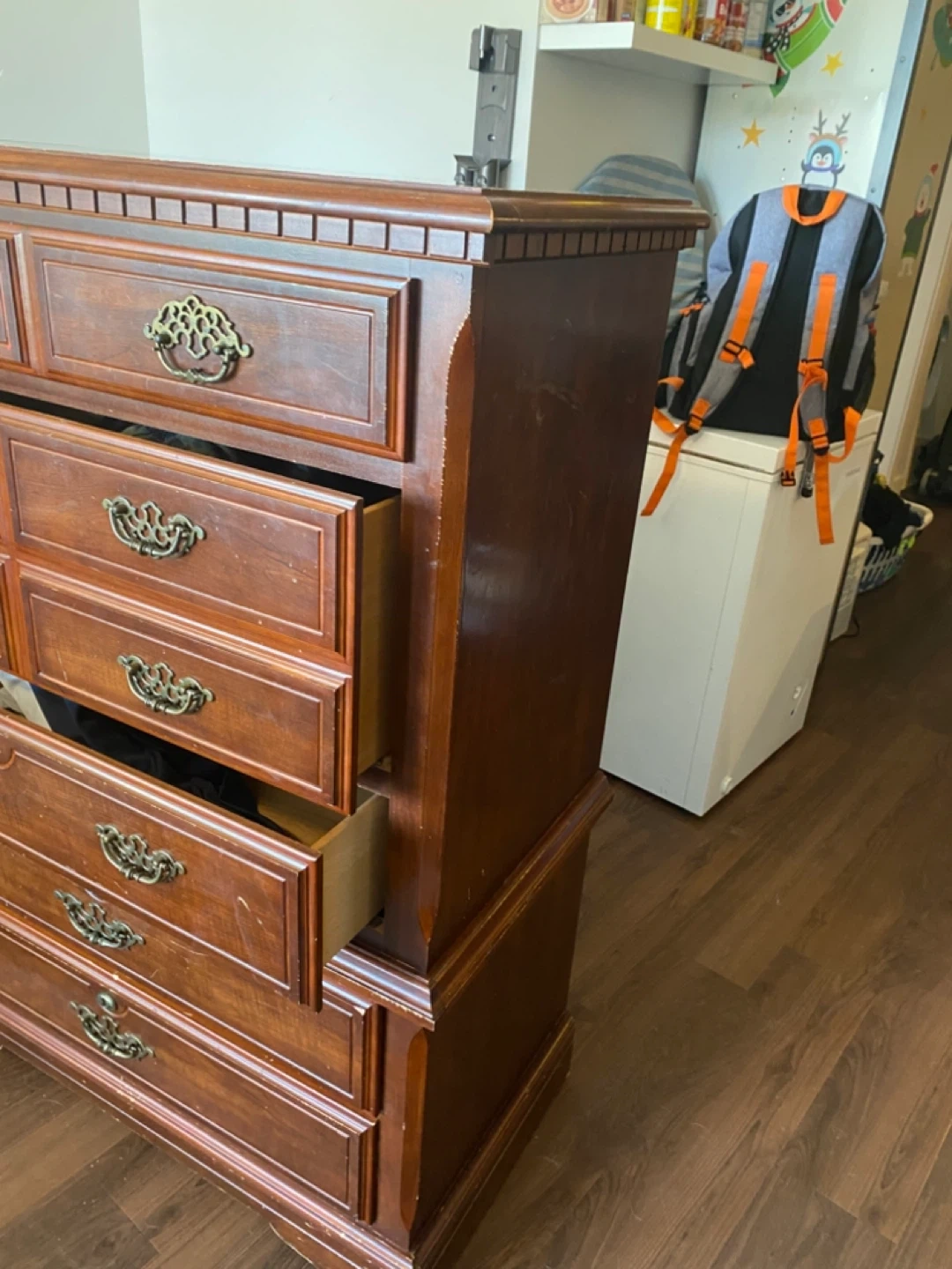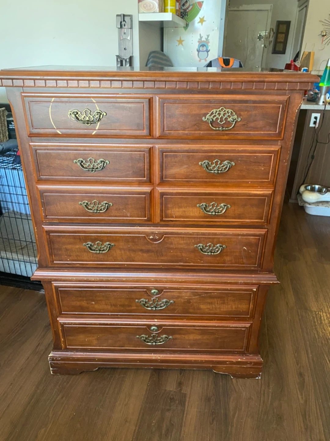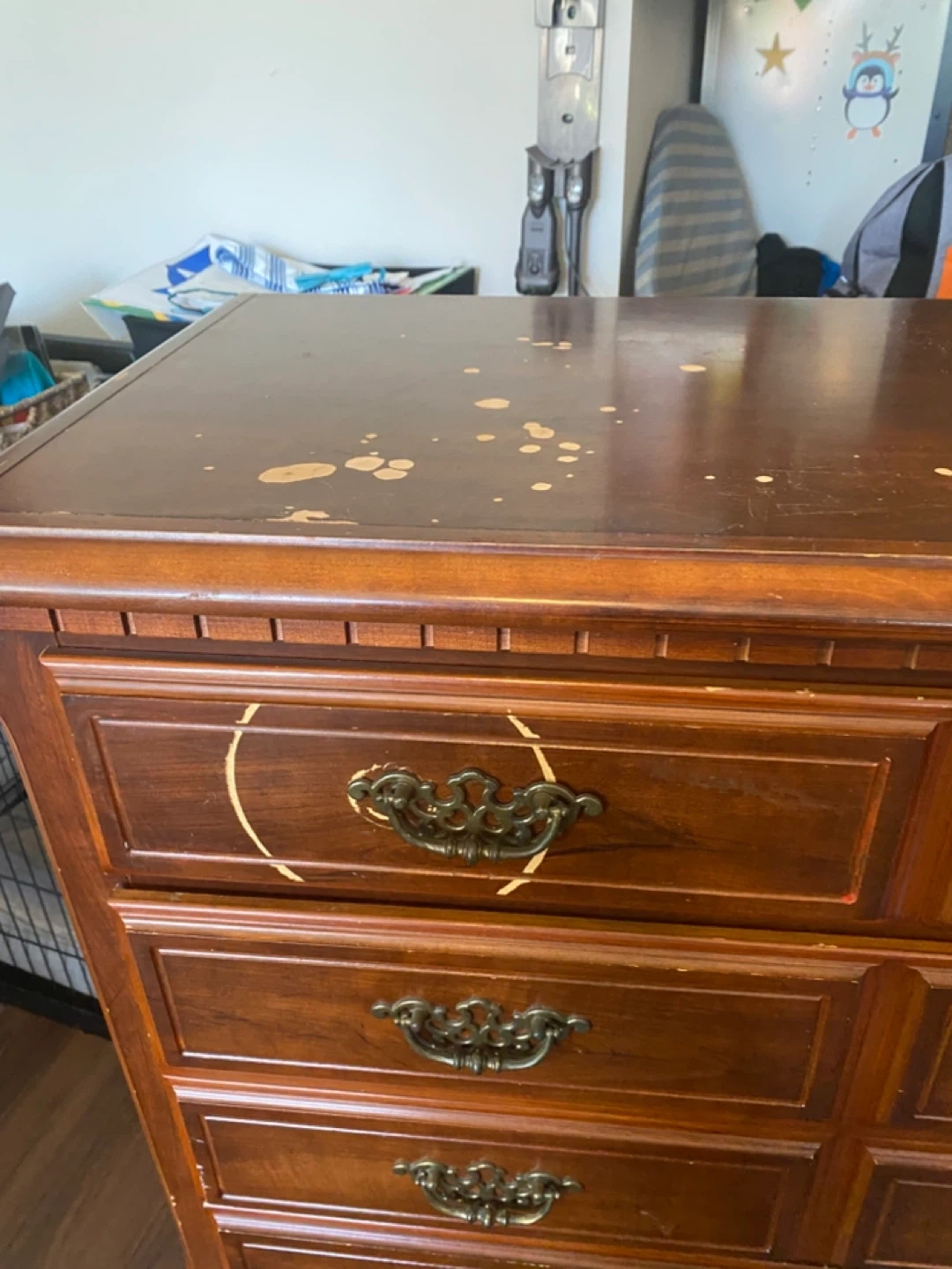 This is a wooden dresser with 5 drawers. The top surface has some marks and scratches. Some drawer fronts also have scuffs and scratches. Solid construction, great for storage.