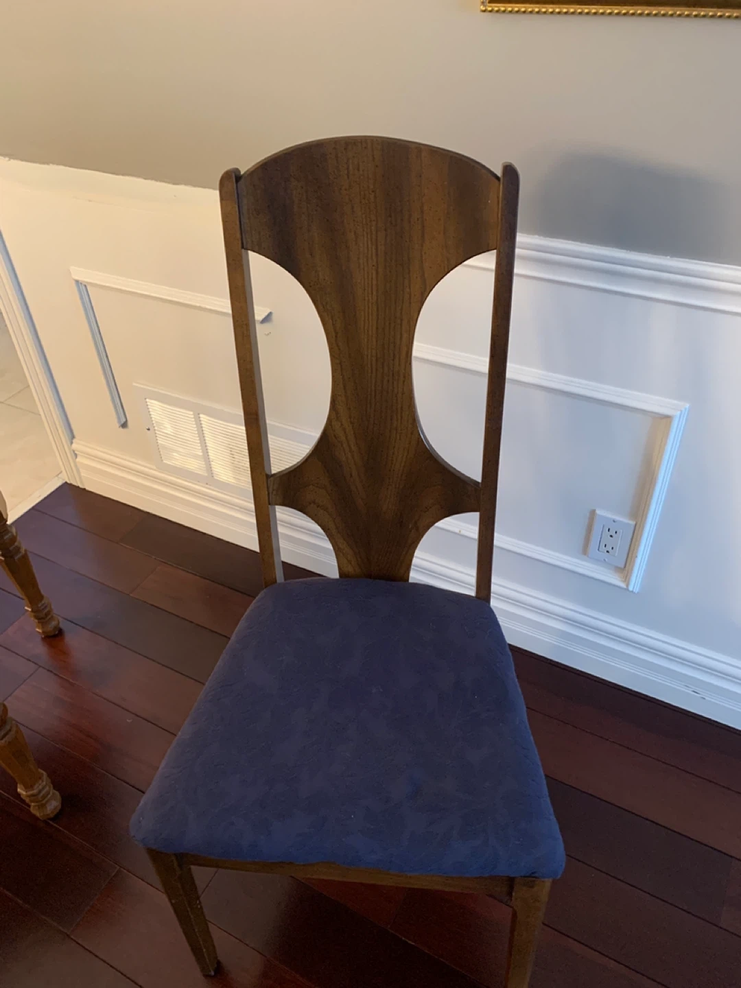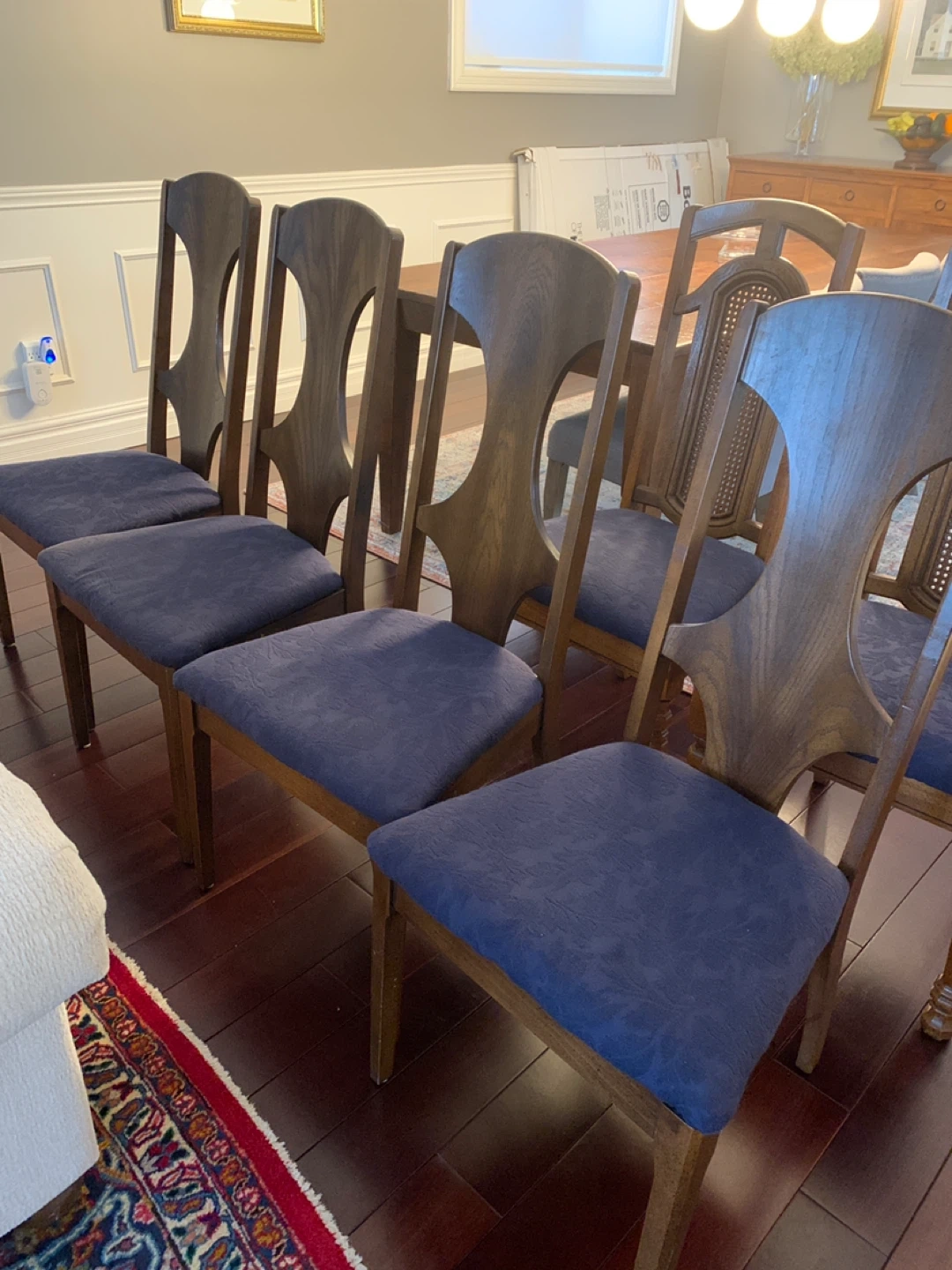 Set of 6 dining chairs with sturdy wood frames and upholstered seats. The dark blue fabric has a subtle pattern. These chairs are ready for your dining room! $25 each .