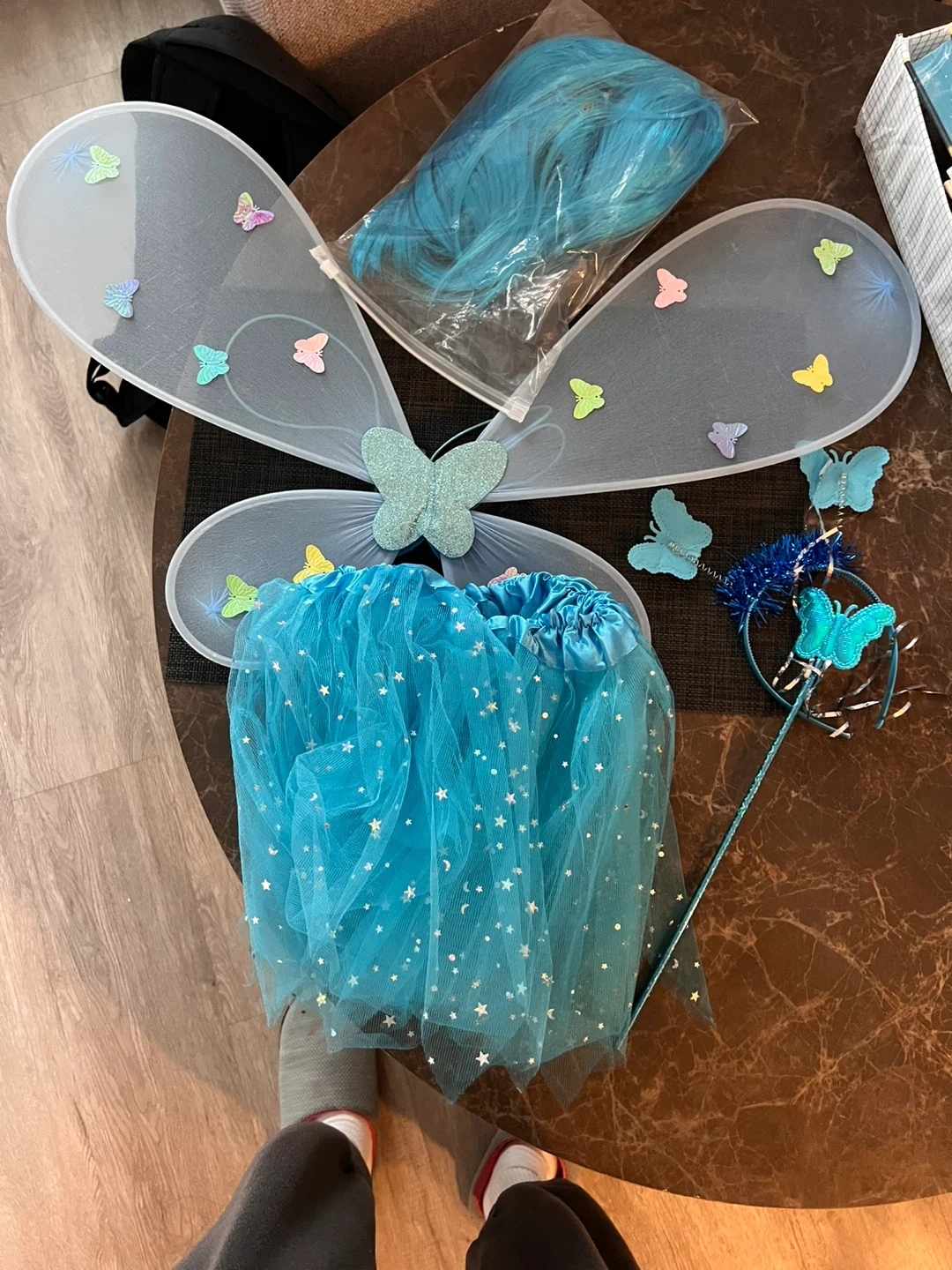 This fairy costume set includes a blue sparkly tutu adorned with stars and matching iridescent wings. It also comes with a blue wig and a fairy wand with a butterfly accent. Perfect for dress-up or Halloween!