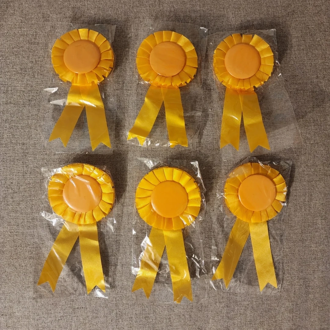 Set of six yellow blank award ribbons. Each ribbon measures 15.5cm long and 8cm wide. Features a pin backing for easy attachment. Perfect for awarding achievements or participation!