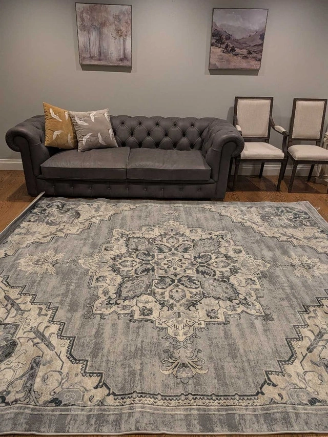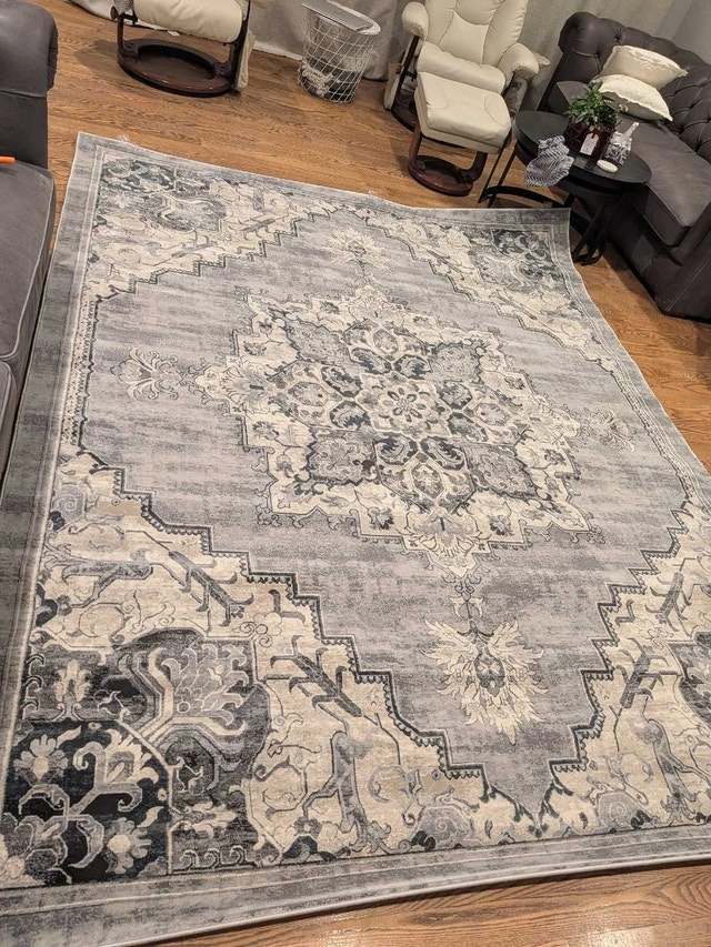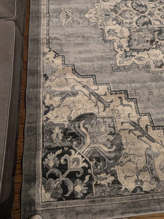Brand new Gertmenian Thomasville rug, originally $830 + tax. Beautiful and soft with an 11mm pile height and ultra-high density weave. Grey tones. Measures 7ft 10" x 10ft. Let me know if you're interested!
