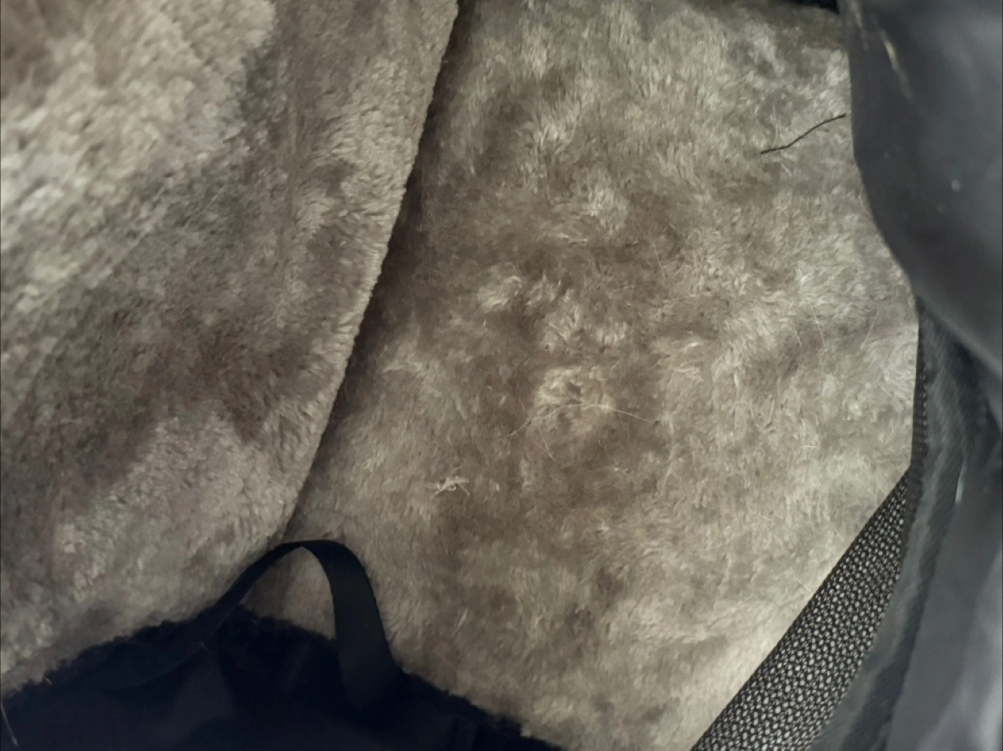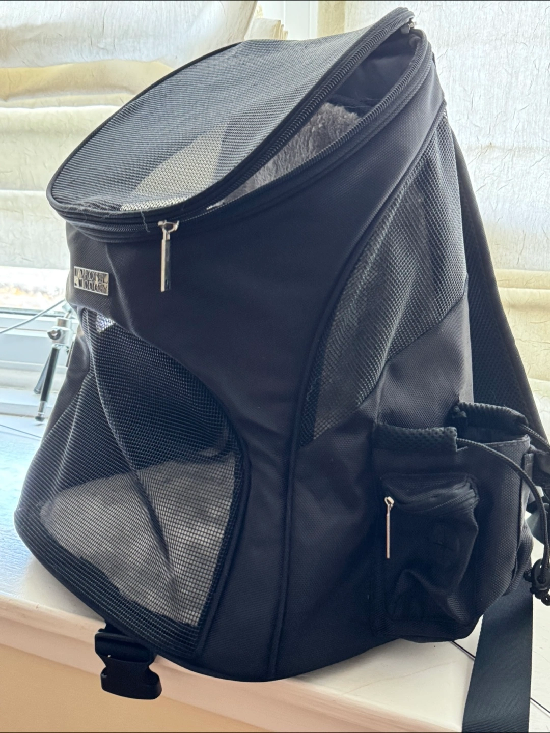 A black backpack-style pet carrier. The backpack is equipped with mesh panels. Includes a soft, plush interior. It's perfect for a cozy trip with your furry friend.