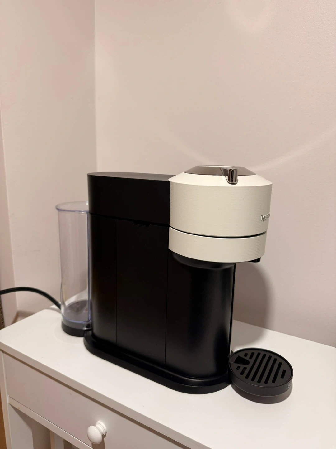 This Nespresso Vertuo machine brews coffee in 7 cup sizes. It features a simple one-touch button operation. It’s in perfect condition (like new) no scratches, super clean because I used it like 3 times. I’ll give you the capsule holder as I gift