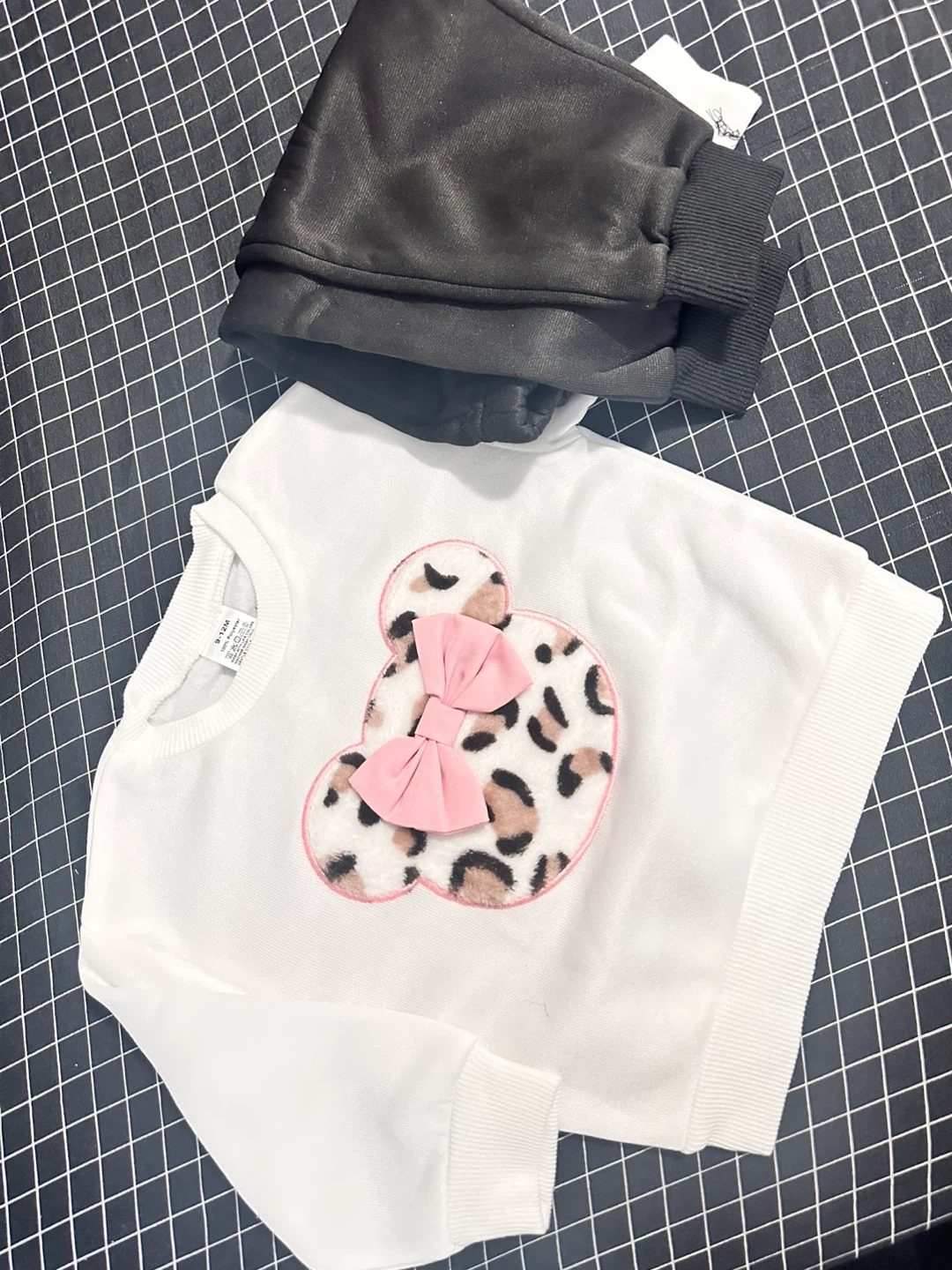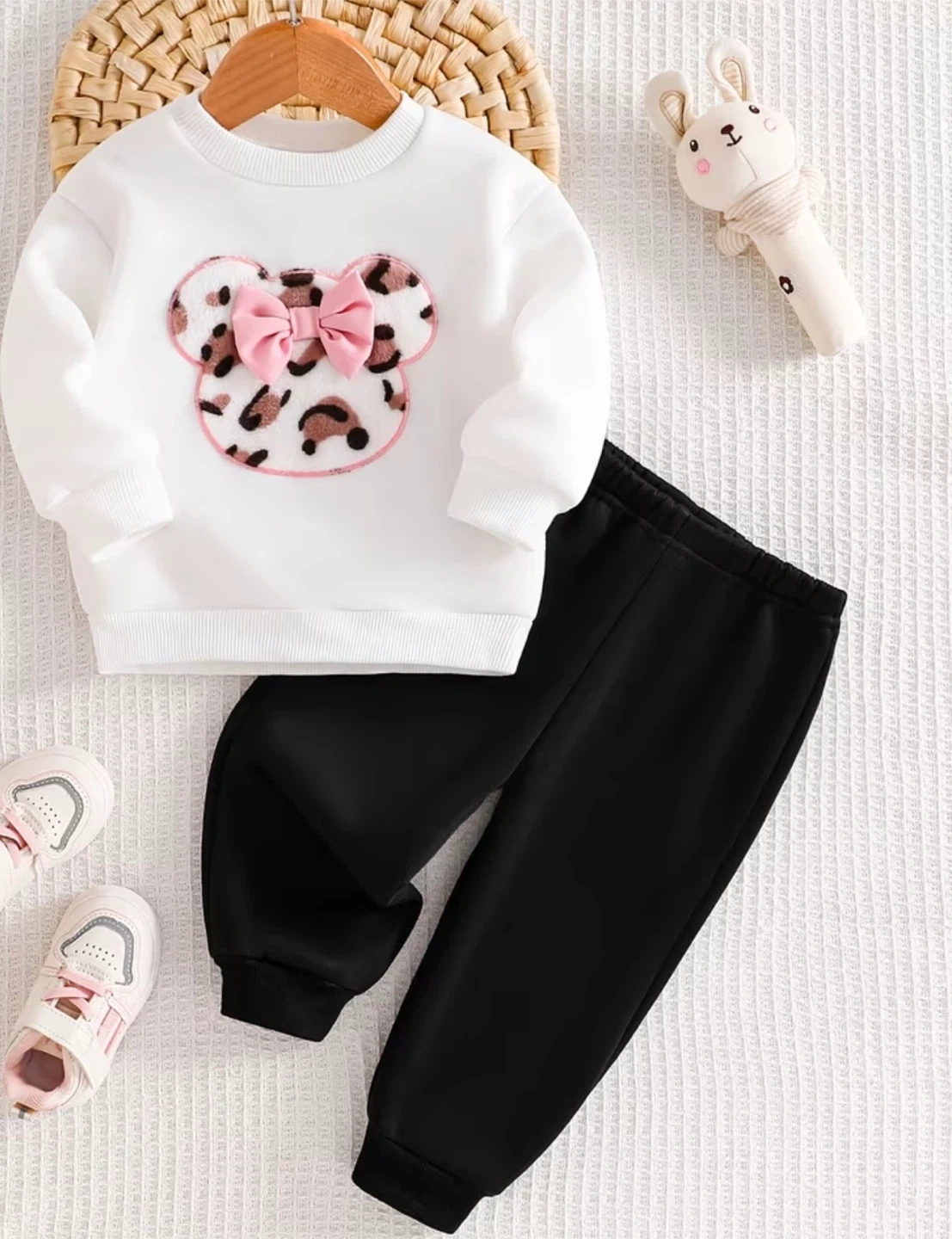 Cute white long-sleeve sweatshirt featuring a Minnie Mouse appliqué with leopard print and a pink bow. Comes with matching black elastic-waist pants. Perfect for everyday wear!