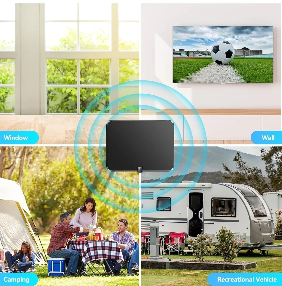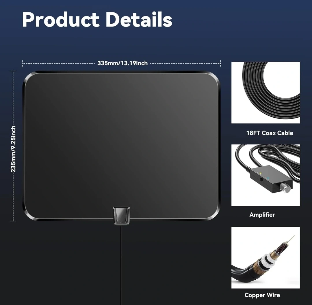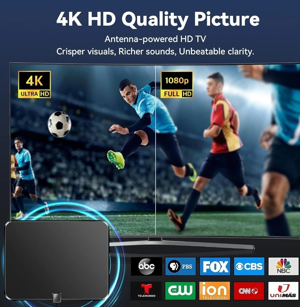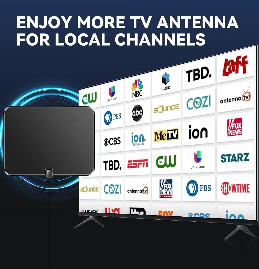 This indoor TV antenna offers a 2200+ mile range with a 2026 upgrade and signal booster. It supports 4K 8K HDTV and Smart TVs. Includes an 18ft coaxial cable and amplifier. Copper wire construction ensures strong signal reception.