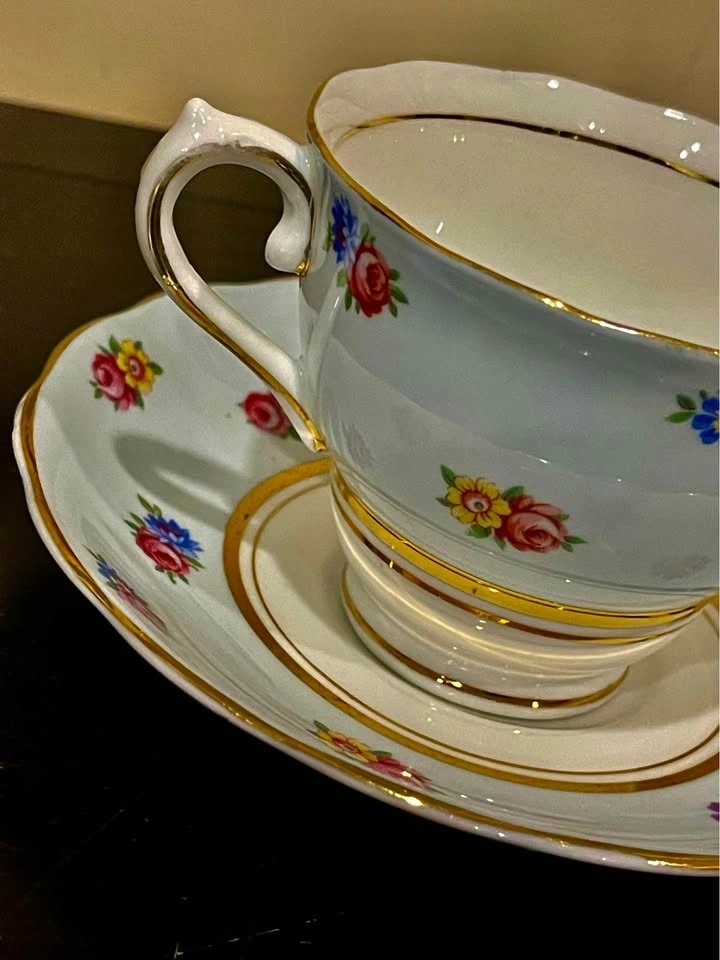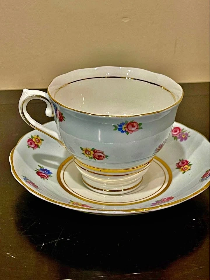 Porch pick up Eglinton and Dufferin. No chips, no cracks, no scratches, no gold loss. Measurements: Cup is 4" in diameter with handle and 2-5/8" in height, saucer is 5-5/8" in diameter.