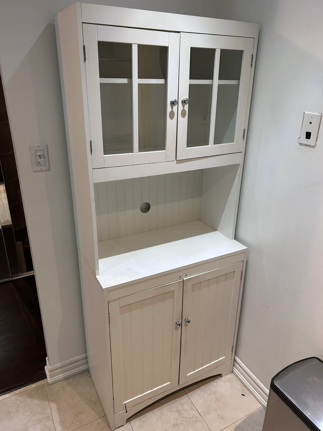 White kitchen cabinet with space for appliances featuring glass cabinet doors on top and solid doors on the bottom. It has an open shelf with a cable management hole. This piece offers ample storage for kitchen or dining essentials. Bottom doors are missing magnet connection.