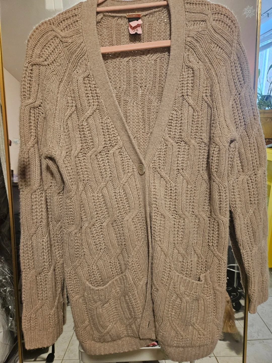 Cozy knit cardigan from Maje. Features a classic button-front closure and two front pockets. Made with a blend of wool and acrylic. Perfect for layering during cooler weather!
