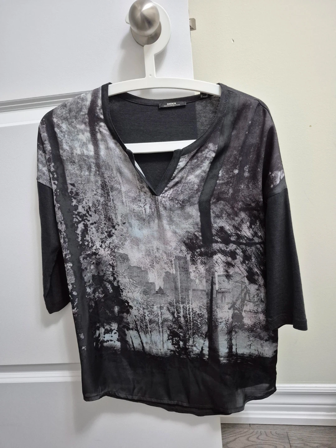 This Mona Lisa top features a striking black and grey landscape print on the front. It has a V-neck and 3/4 sleeves. The back is a solid dark grey.