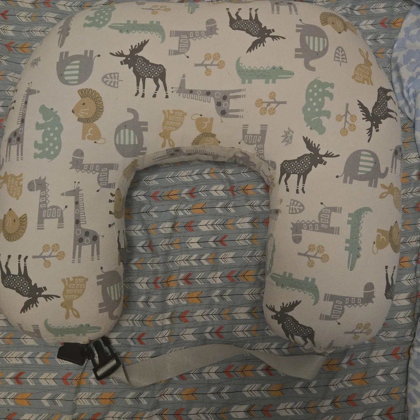 This nursing pillow features a fun print with various animals like elephants, giraffes, and moose. It includes a grey strap with a buckle for securing. The cover is soft and comfortable for feeding time.