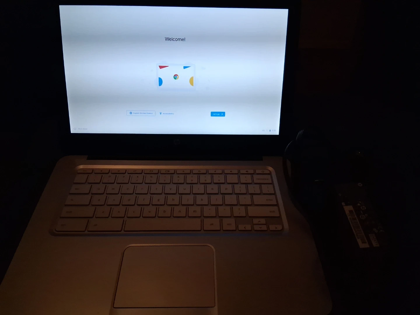 HP Chromebook laptop for sale. This device has a silver finish and a QWERTY keyboard. It's ready for setup with a "Welcome!" screen displayed.