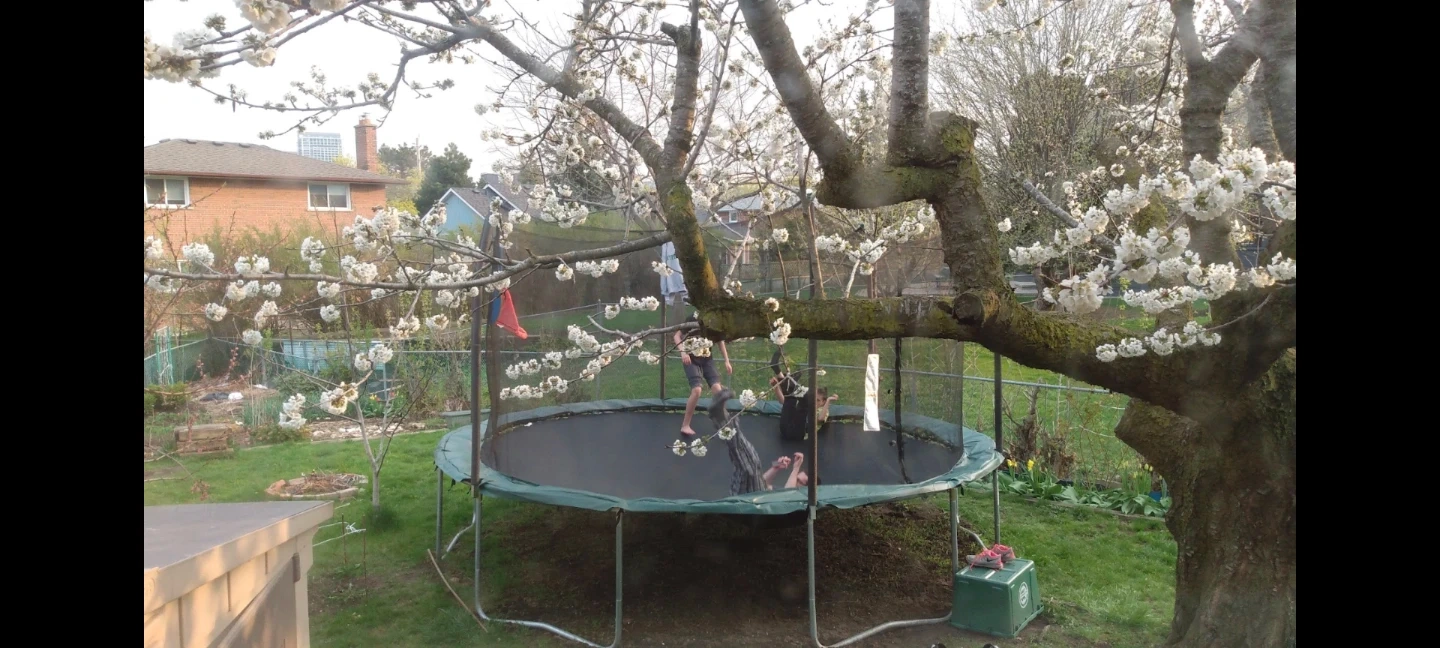 Round trampoline with a green safety pad and black netting enclosure. It has a metal frame and spring cover.Used two summers. Stored during winter. It's ready for outdoor fun in the backyard! Pick up only