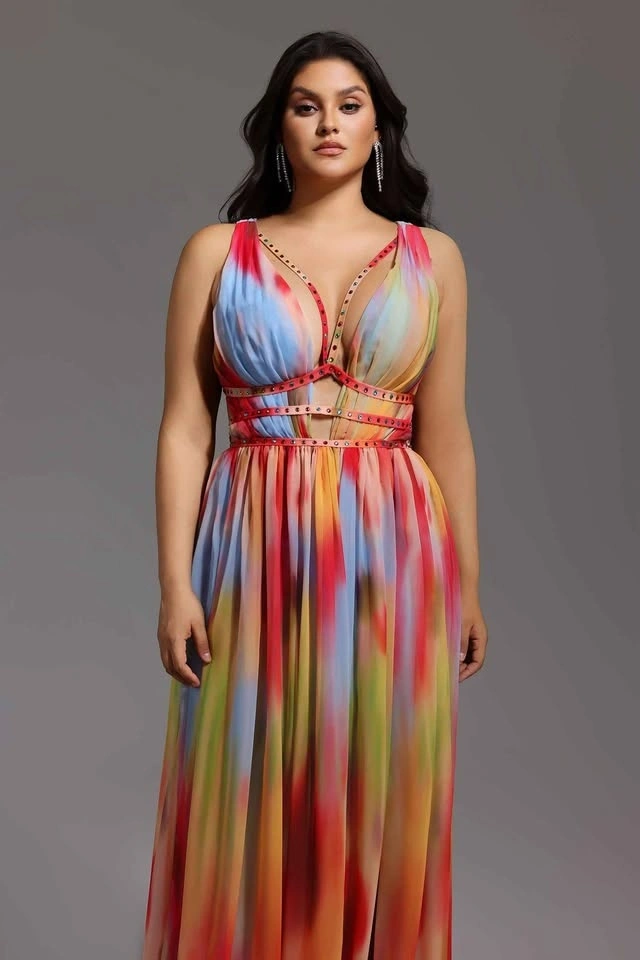 Vibrant maxi dress, super flowy. Has a cool tie-dye print with lots of bright colors like red, blue, yellow, orange. Deep V-neck and cute cutouts at the waist. Straps and waist have little beads, adds a nice touch. Great for summer parties or vacation. Still has tags on. XL (12-14).