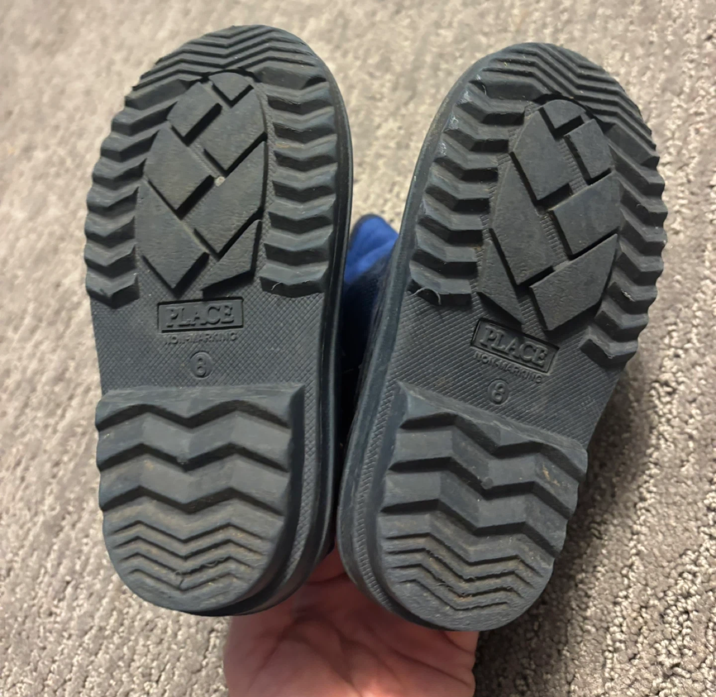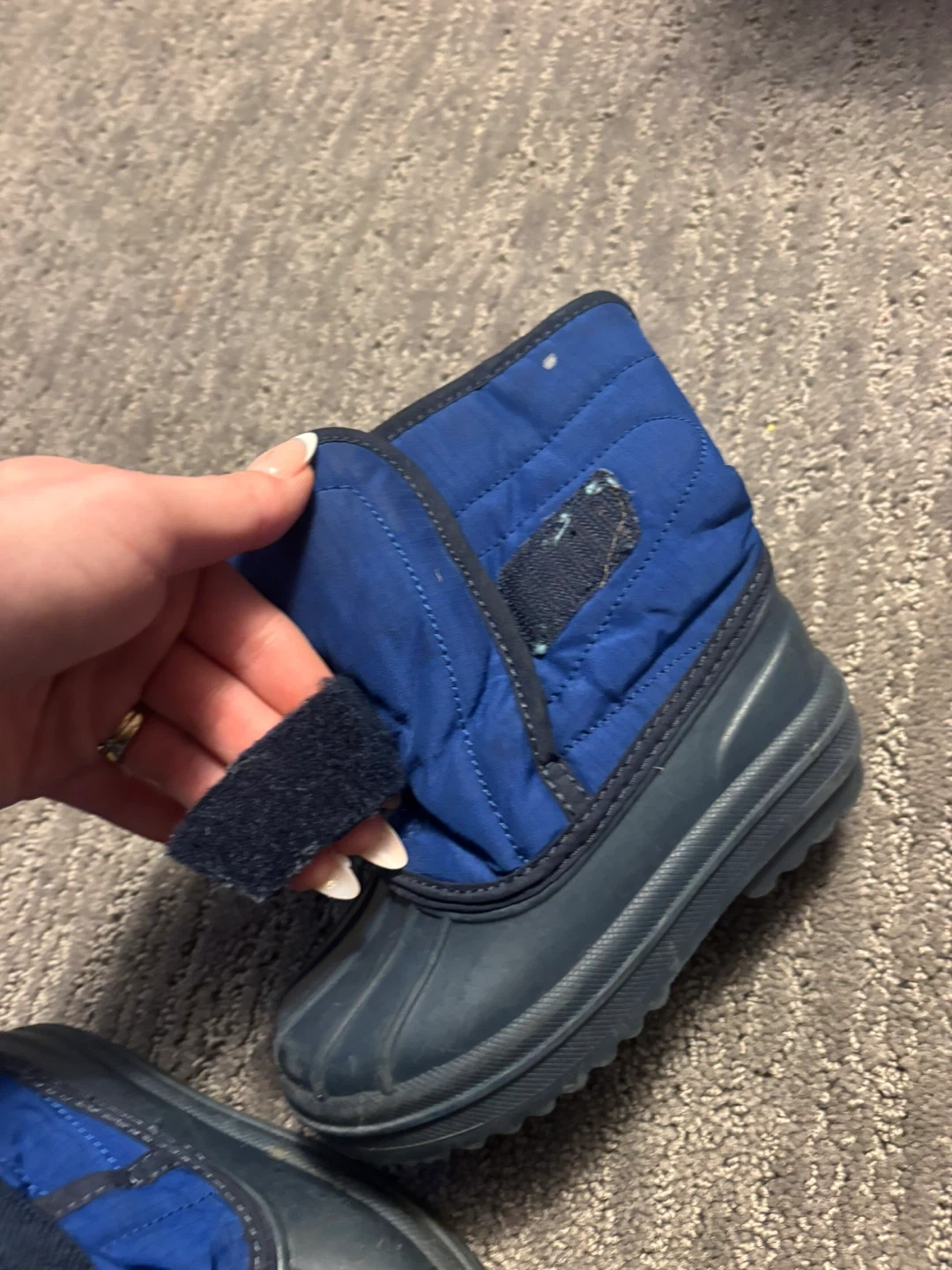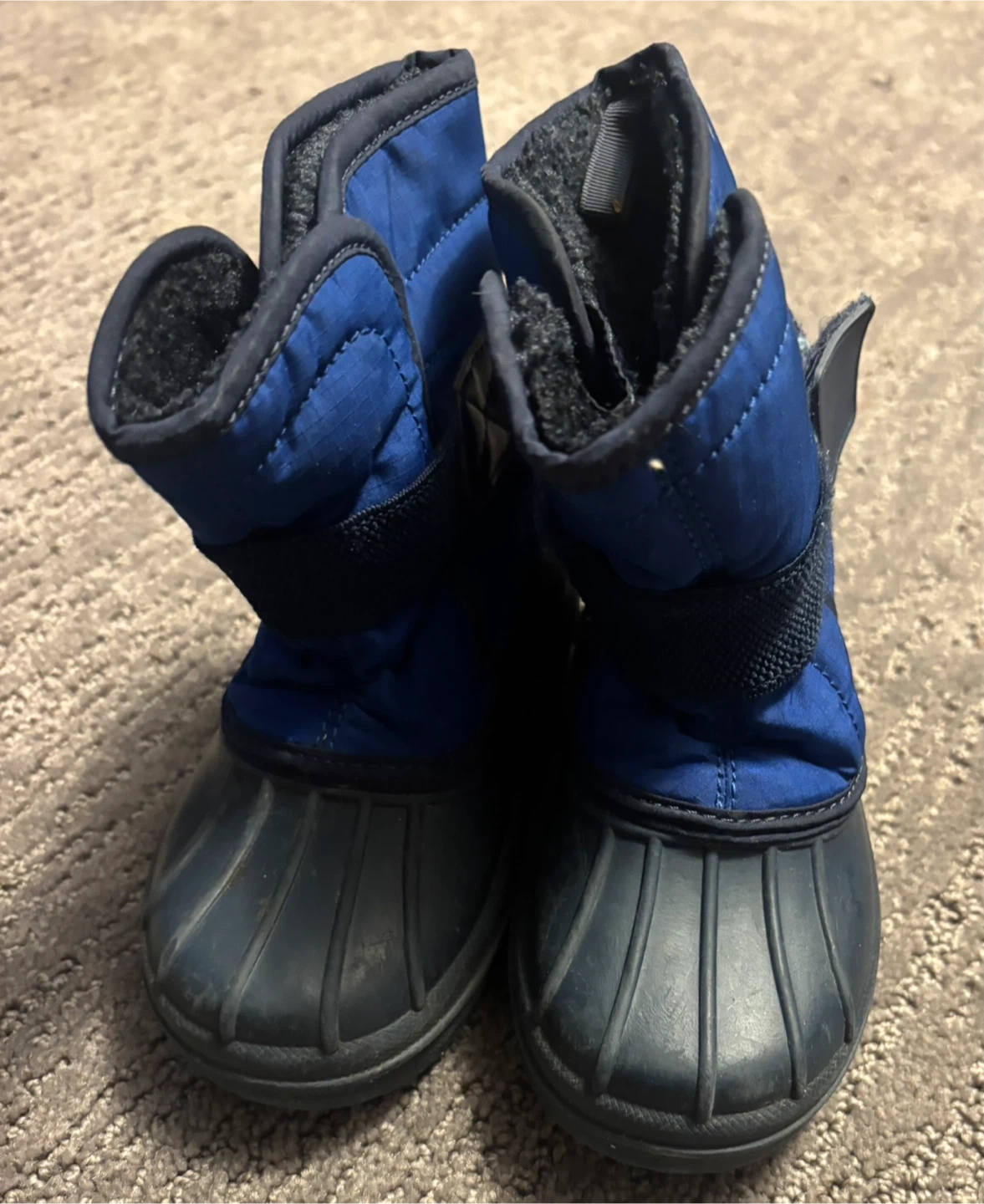 Toddler winter boots in blue from The Children's Place. They're a size 8 with velcro closures for easy on and off. Perfect for keeping little feet warm and dry during snowy weather!