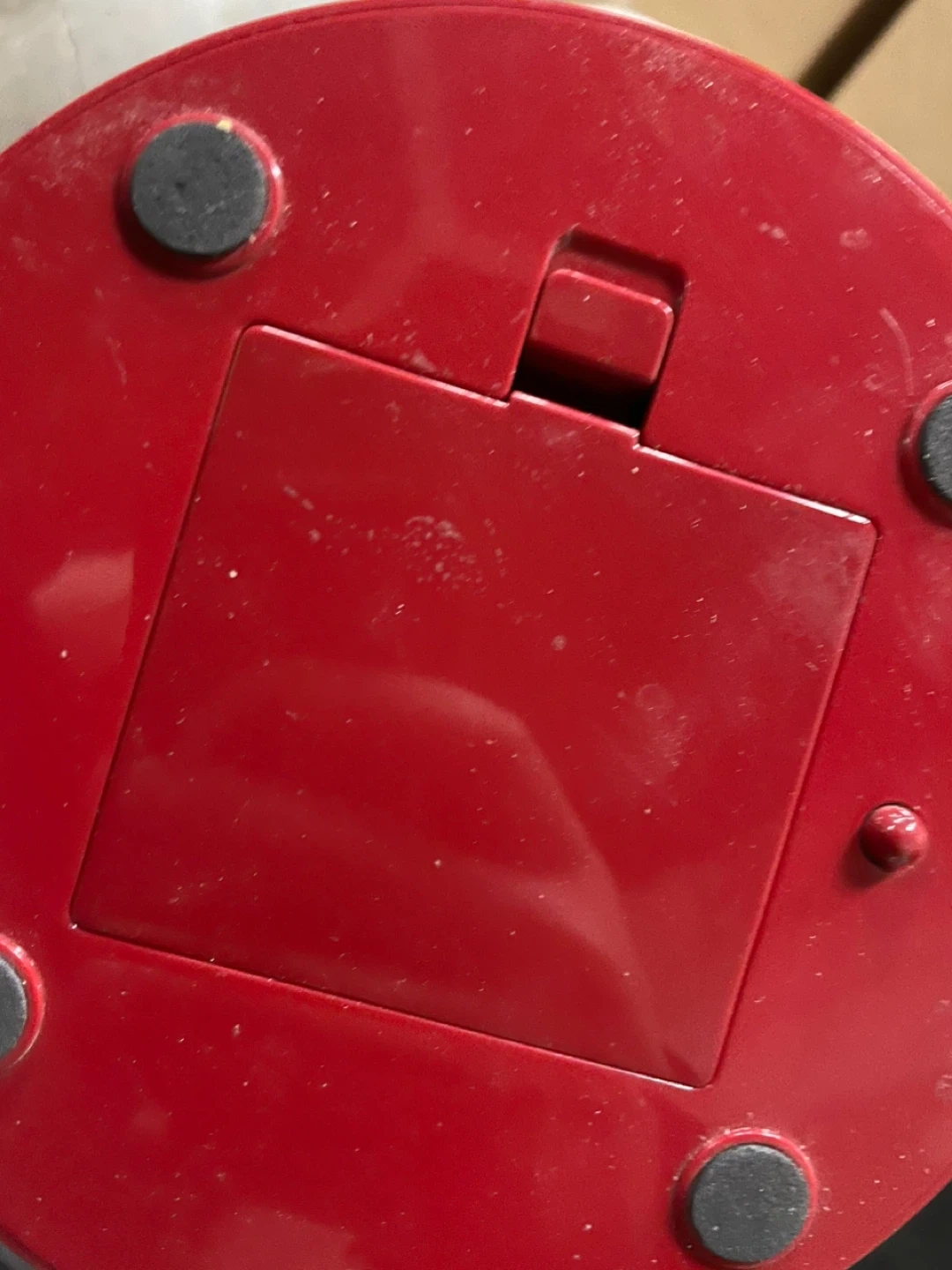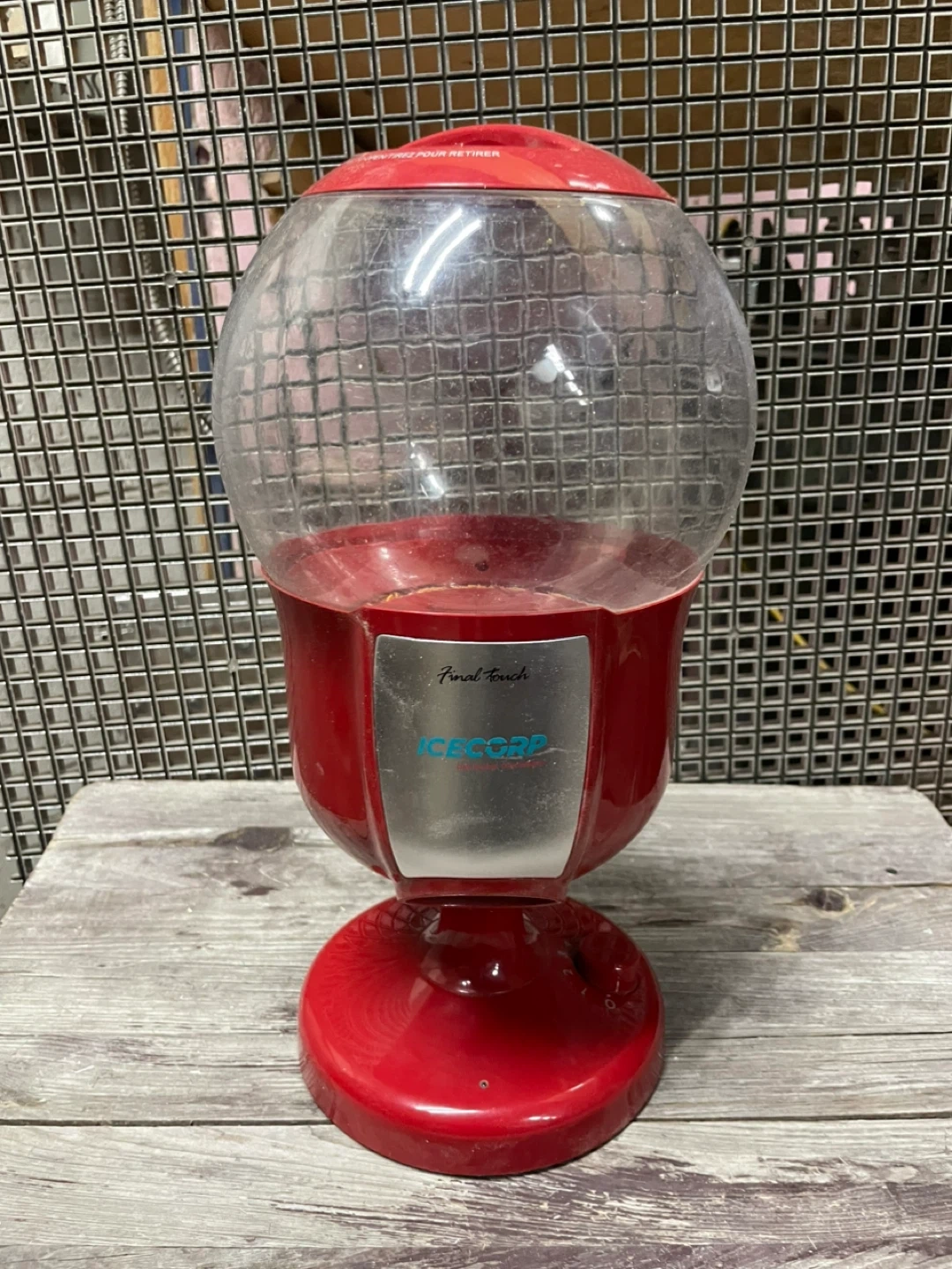 This is a red IceGrip gumball machine. It uses 4 AA batteries. The globe is clear plastic and the base is red plastic. It's ready for your favourite candy!