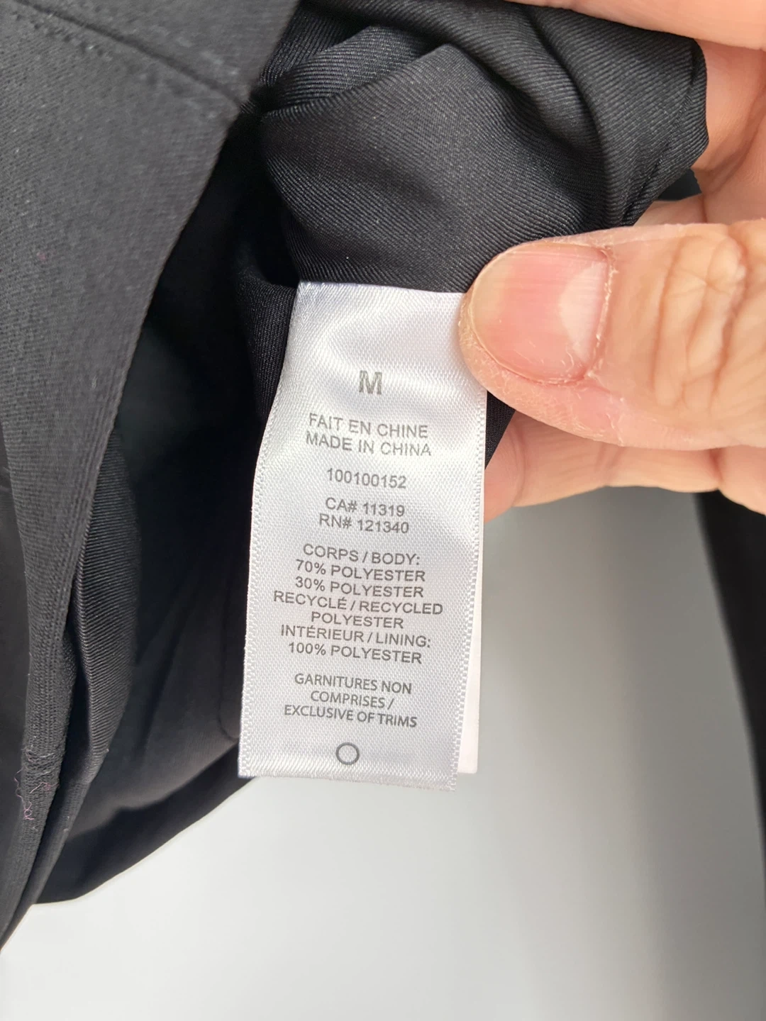 A Dynamite Charlotte Short Airflow Blazer in Jet Black. This blazer is size medium and made from 70% polyester and 30% recycled polyester. The lining is 100% polyester. It's a great layering piece for many occasions!