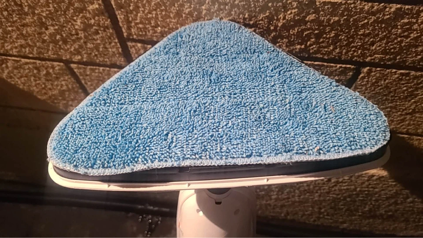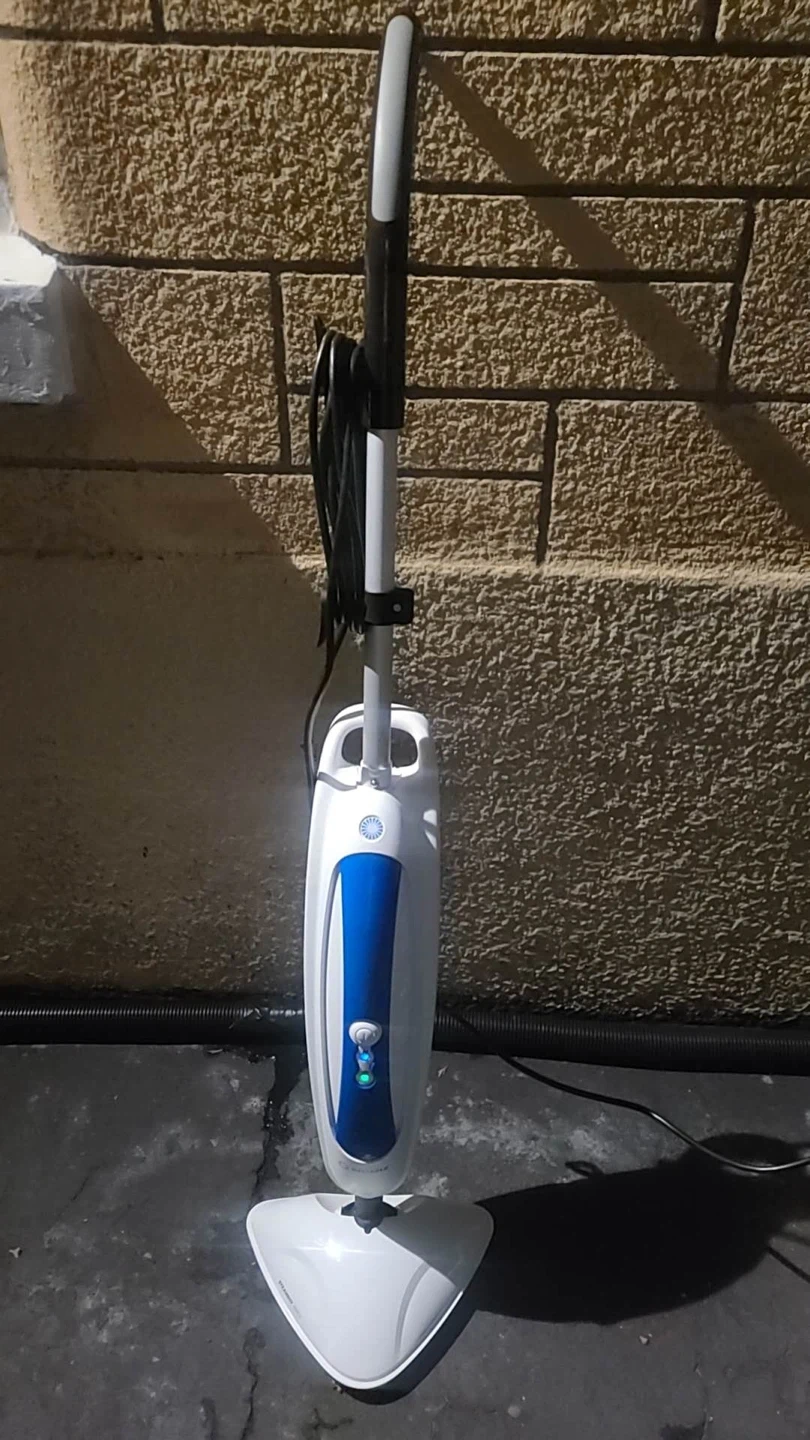 Haan steam mop with a blue microfiber pad. Includes a water tank for steam cleaning. Great for getting your floors sparkling clean!