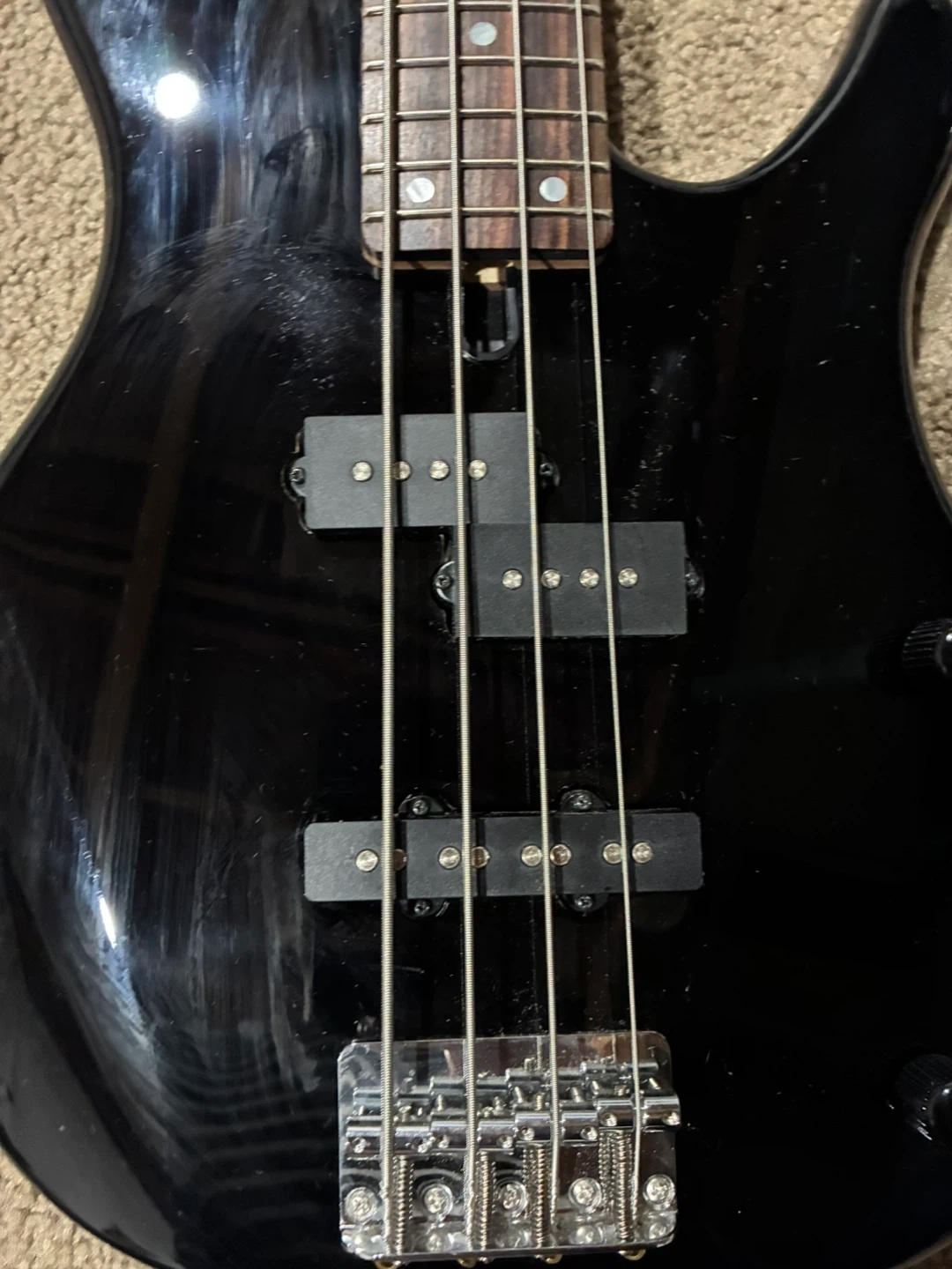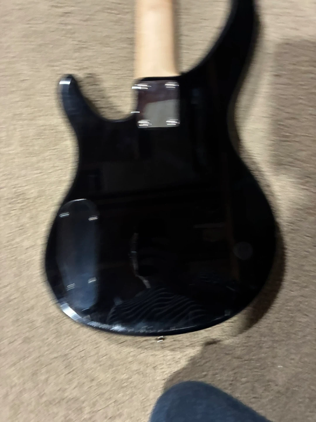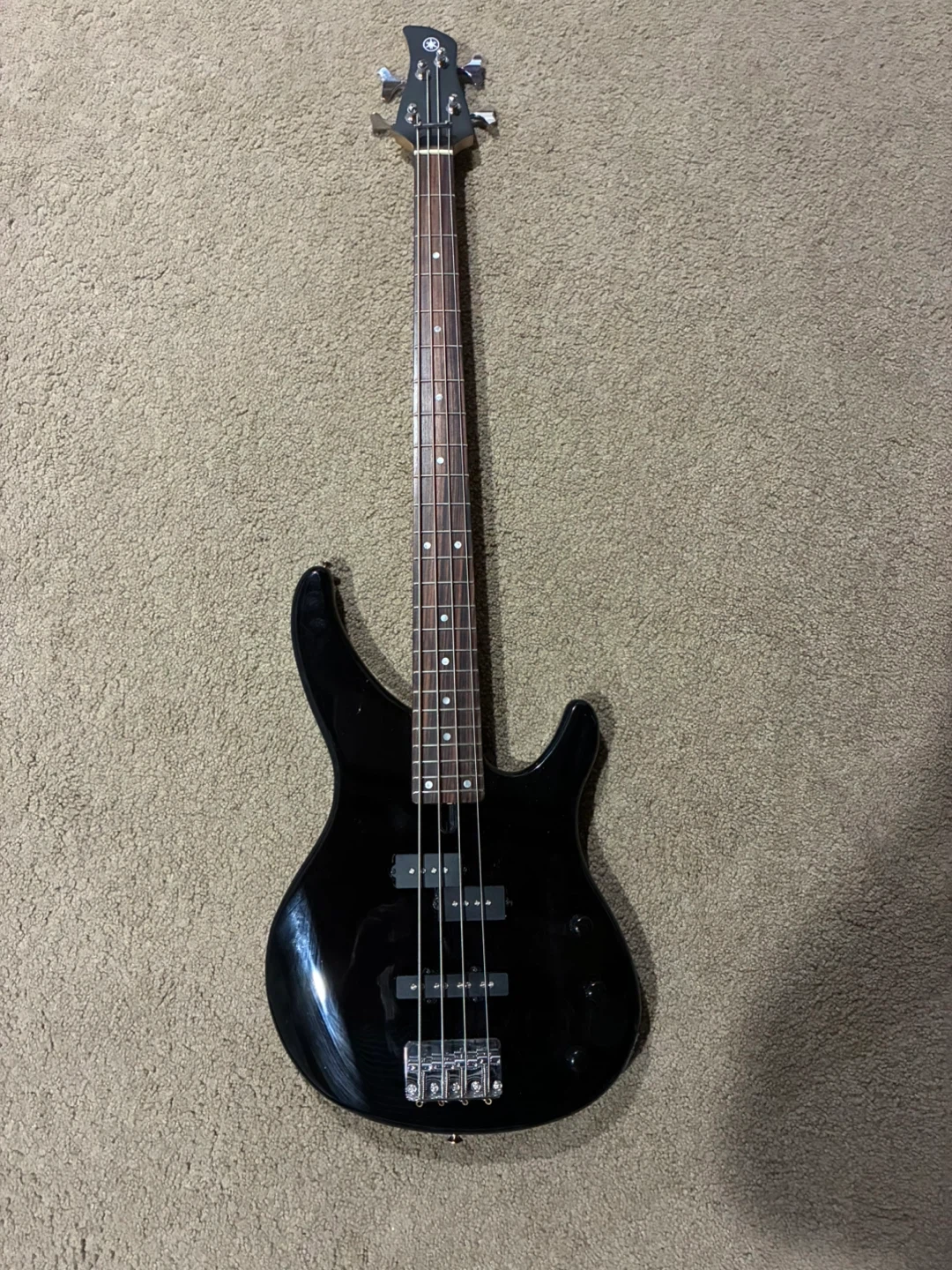 This is a black electric bass guitar by Yamaha. It features a sleek, glossy finish and a rosewood fingerboard. It's ready for practice or performance!
