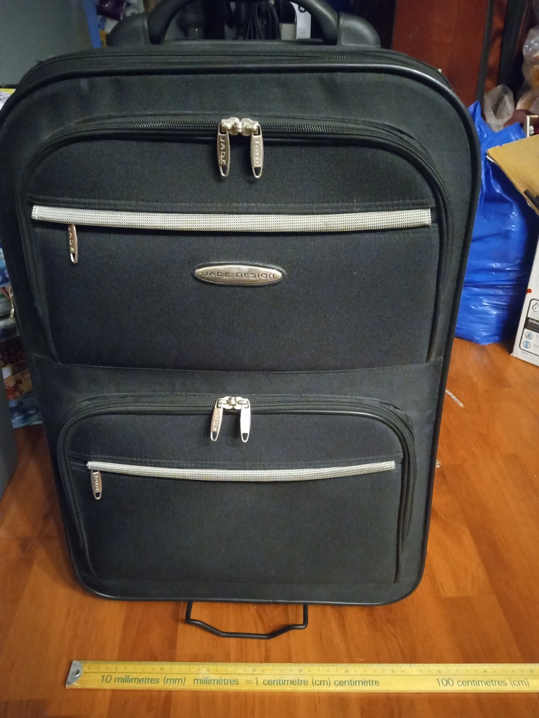 Black, two wheel, 35 cm x 60 cm x 26-29 cm expandable suitcase. pull out handle with cracked case, but fully functional. Jade Design brand. Clean: smoke-free, bug-free, pet-free.