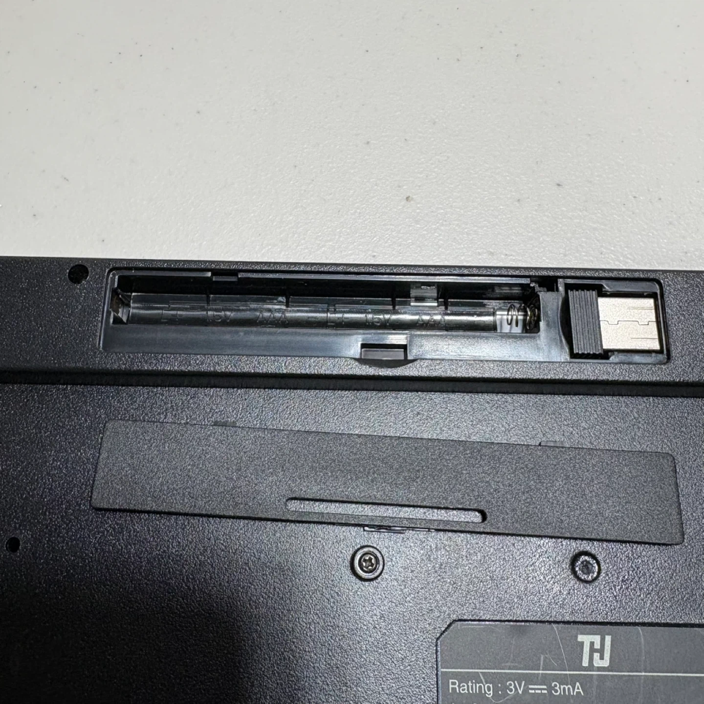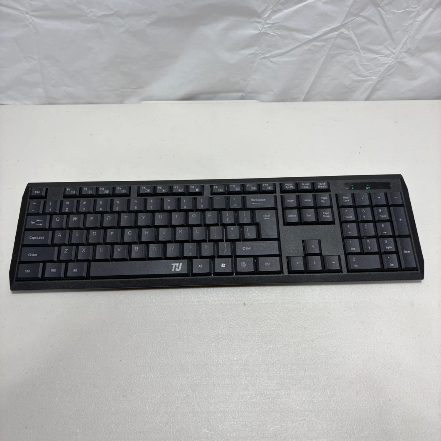 This is a TJ 2.4G wireless keyboard. It's black and includes a full number pad. Powered by 2 AA batteries, it's great for general computer use.