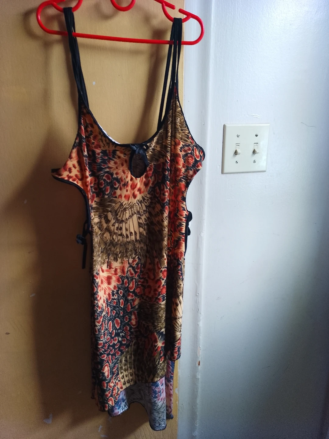 This is a women's slip dress or lingerie piece. It features a colourful animal and floral print. Adjustable spaghetti straps and tie sides for a custom fit. Lightweight fabric.