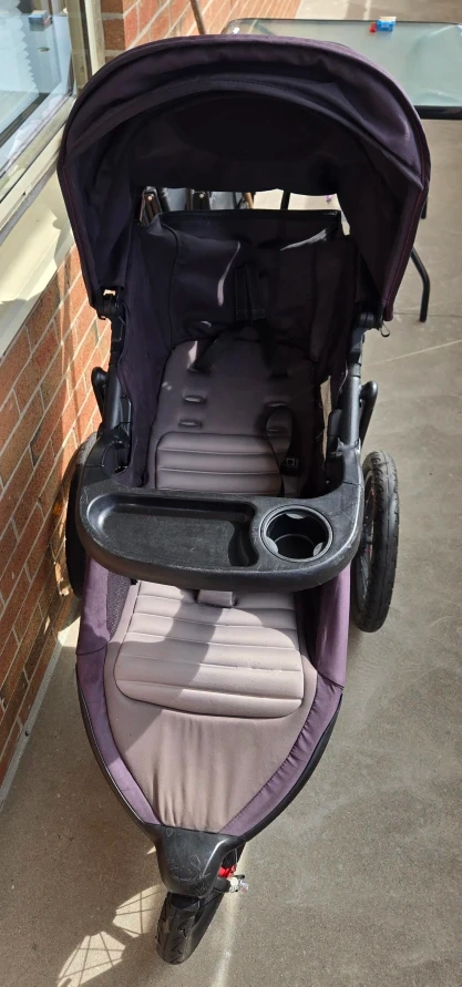 Selling a jogging stroller in black. It features a sturdy frame and smooth-rolling wheels, perfect for active parents. There's also a convenient parent tray with cup holders and a storage basket underneath for your essentials. Great for walks or jogs around the neighbourhood!