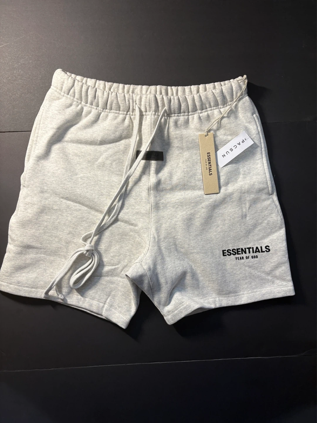 Light grey sweat shorts from Fear of God Essentials. They're made from a soft cotton blend and feature an elastic waistband with a drawstring. Includes original packaging. size xs hit me up for any offers or trades