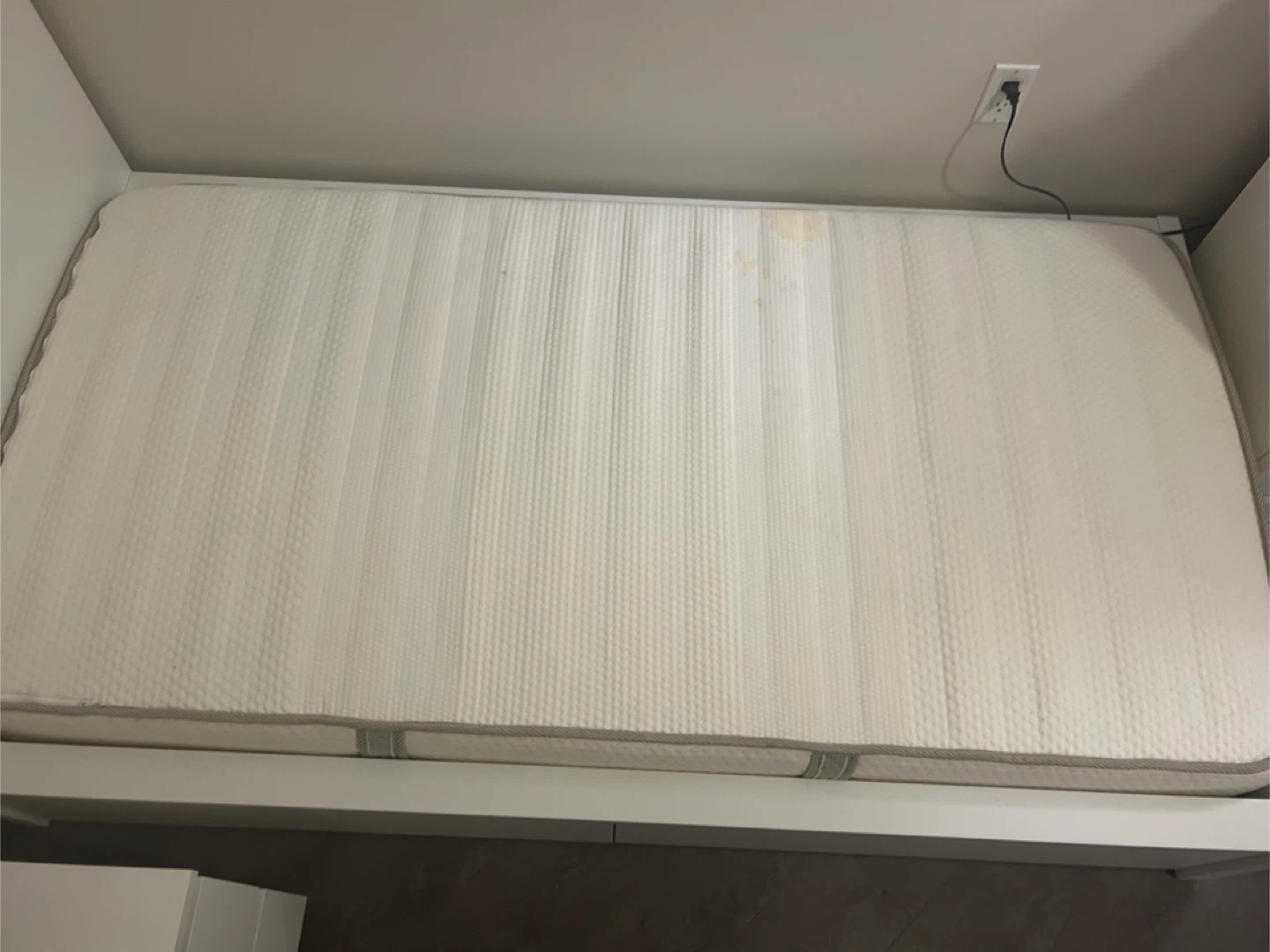 White Ikea twin bed frame featuring ample storage drawers. Includes a comfortable Latex mattress with a striped quilted top. Perfect for bedrooms needing extra storage space!