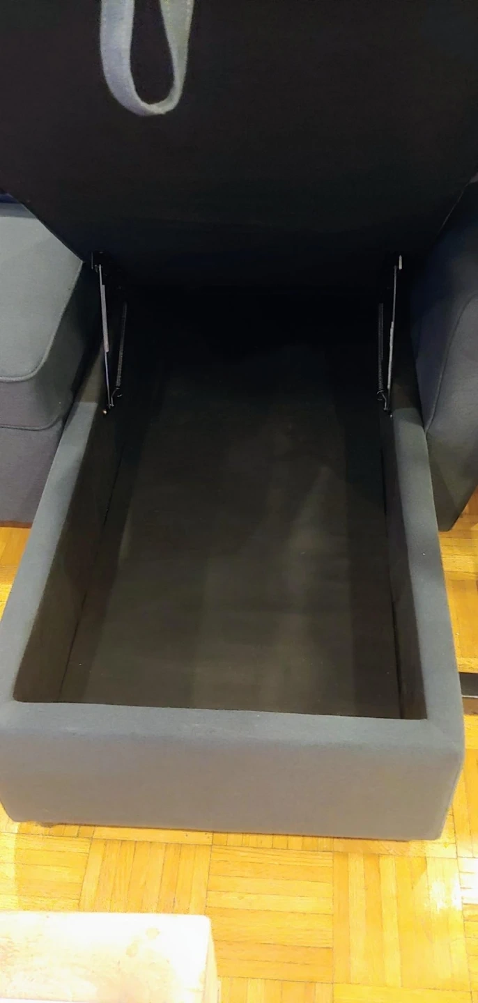 Apologies in advance, but can't recall if the storage component is reversible. I believe it is, but you're more than welcome to come by and check it out. No hardware for assembly, everything just snaps together.